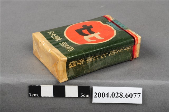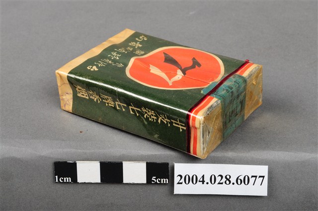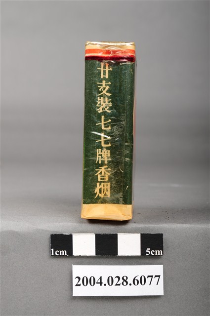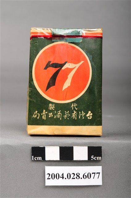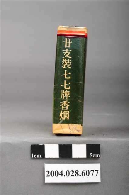 1.本物件為「臺灣省菸酒公賣局代製七七香煙」,為公賣局代製的軍煙,綠色包裝,正面圖案為紅色圓形商標,中央印有文字「七七」,下方文字為「陸軍專用.轉售充公」。背後圖案為紅色圓形商標,中央印有數字「77」,下方文字為「台湾省菸酒公賣局代製」。兩旁各印有文字「廿支裝七七牌香烟」。上方封口處貼有藍色貼紙,印有文字「台湾省、TWT、菸酒公賣局、豐原、菸草工場」。