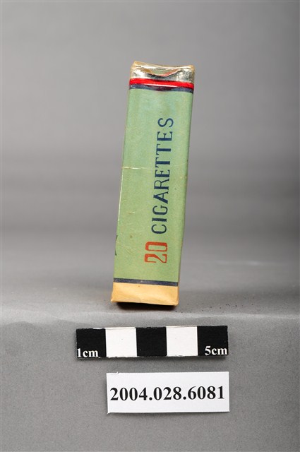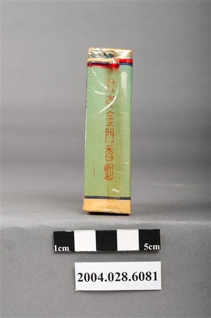 1.本物件為臺灣省菸酒公賣局代製金門香煙,為紙盒包裝,為四方體,其主要標示面皆為淡藍色底色,其中一面有品牌圖像,內有「金門」紅色字樣,並有「轉售」、「充公」藍色字樣,「代製」、「台灣省菸酒公賣局」橘色字樣,另一面則有金門島圖樣,上有1座碉堡,並有「軍用」藍色字樣,其側邊一面有「20」橘色字樣、「CIGARETTES」深藍色字樣,一面有「廾支金門香烟」橘色字樣,菸盒開封處有紙條黏貼封住,紙條上有「台灣省菸酒公賣局代製」深紅色字樣,底部有圓形圖形內有「金門」藍色字樣,物件有塑膠包裝所包覆。