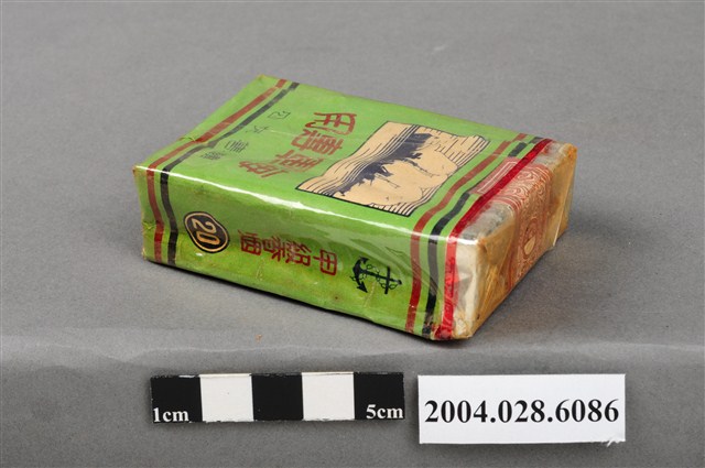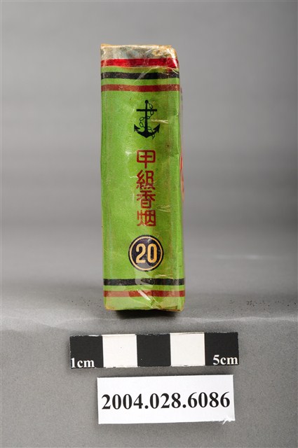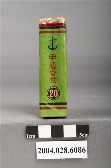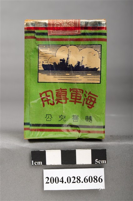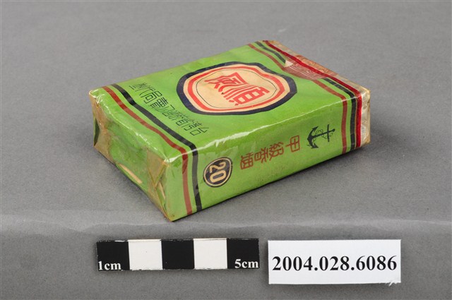 1.本物件為「臺灣省菸酒公賣局代製順風香煙」,為公賣局代製的軍煙,綠色包裝,正面圖案為紅色與藍色的圓形商標,中央印有文字「順風」,下方文字為「台湾省菸酒公賣局代」。背後上方為船艦圖案,下方文字為「海軍專用、轉售充公」。兩旁各印有船錨圖案與文字「甲級香烟」、數字「20」的藍色圓形圖案。上方封口處貼有淺紅色貼紙,中間圓形圖案印有數字和英文文字「20、CIGARETTES」。