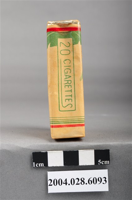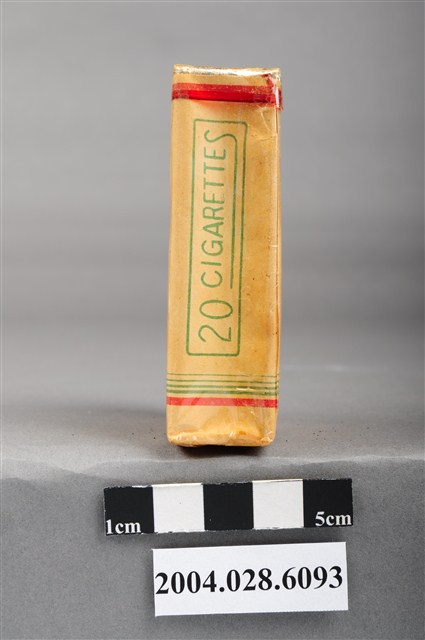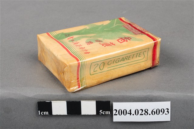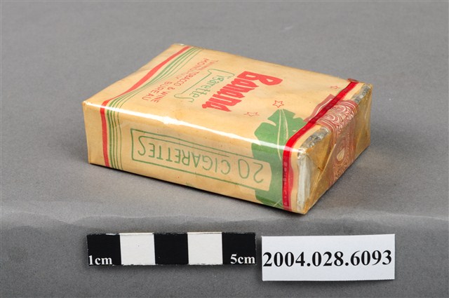 1.本物件為臺灣省菸酒公賣局出品香蕉香煙,為紙盒包裝,為四方體,其主要標示面中,其中一面有香蕉樹之綠色剪影,並有「香蕉香烟」、「台灣省菸酒公賣局」紅色字樣,另一面右上有香蕉樹葉剪影,並有「Banana」紅色字樣、「Cigarettes」綠色字樣、「TAIWAN TOBACCO & WINE MONOPOLY BUREAU」紅色字樣,其側邊兩面皆有「20 CIGARETTES」綠色字樣,菸盒開封處有紅色紙條黏貼封住,物件有塑膠包裝所包覆。