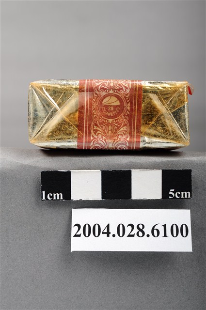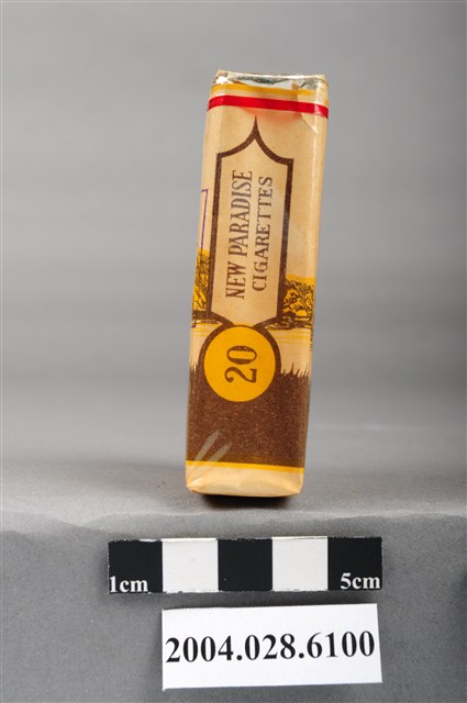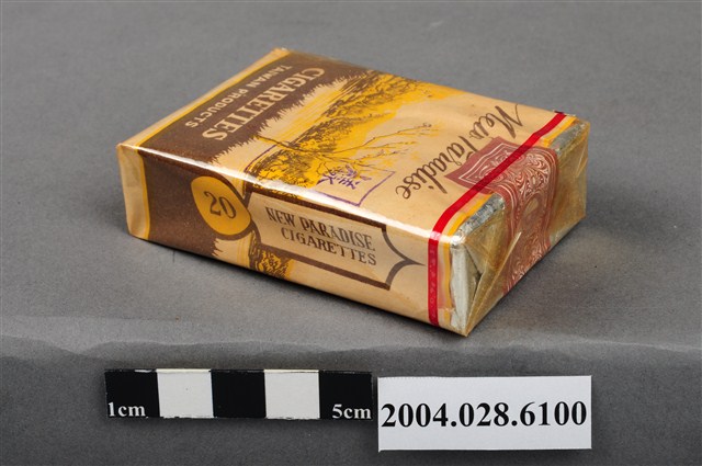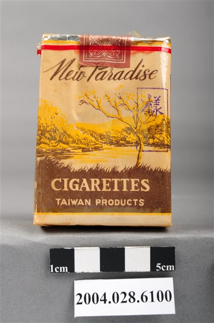 1.本物件為臺灣省菸酒公賣局出品新樂園香煙,為紙盒包裝,為四方體,其主要標示面皆為湖畔樹木風景圖像,惟兩面樹木種類不同,其中一面有「新樂園」、「特選上等高貴烟葉」黑色字樣,與「香烟」、「台灣省菸酒公賣局出品」白色字樣,另一面有「New Paradise」黑色字樣,及「CIGARETTES」、「TAIWAN PRODUCTS」白色字樣,其側邊一面有「二十支裝」黑色字樣與圓圈圖形內有「新樂園」黑色字樣,一面有「NEW PARADISE CIGARETTES」黑色字樣與圓圈圖形內有「20」黑色字樣,菸盒開封處有紅色紙條黏貼封住,底部有「新樂園」黑色字樣,物件有塑膠包裝所包覆。