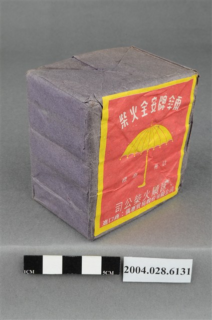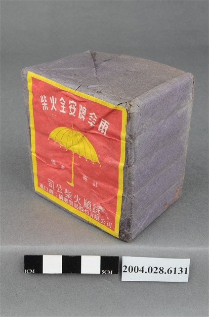1.本物件為詠順火柴公司雨傘牌圖樣火柴,火柴盒正面寫著雨傘牌安全火柴字樣,上有一黃色雨傘商標。 2.火柴又稱為「洋火」、「番仔火」,透過摩擦火柴頭和火柴盒的磷面產生火苗,在打火機和瓦斯不普遍的年代,火柴是不可或缺的民生用品,由於使用率高一般商家也將火柴盒印上廣告達到宣傳效果。