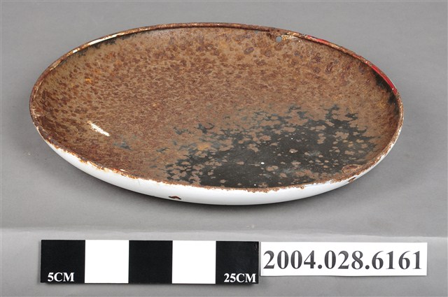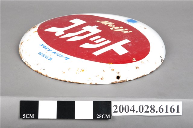 1.本件明治乳業製明治スカット單面廣告鐵牌通身以鐵片製作,作單面琺瑯彩色印刷,其正面邊緣與背面帶有褐色生鏽痕跡,鐵牌周圍分布有3個吊掛孔,呈長49.5公分,寬49.9公分,高5.5公分之圓形淺盤狀廣告吊牌。鐵牌正面以白色為底色,上緣以淺藍色印有圓形外圍帶線狀光芒之圖騰,下緣則印有「スタミナ ドリンク」為能量飲料之意,下接明治乳業名稱。中央作橫式紅底橢圓形框,上印白色「Meiji」,下方印「スカット」字樣。2.本件廣告鐵牌主要掛置於雜貨店等商品販售處,具有廣告宣傳效果。