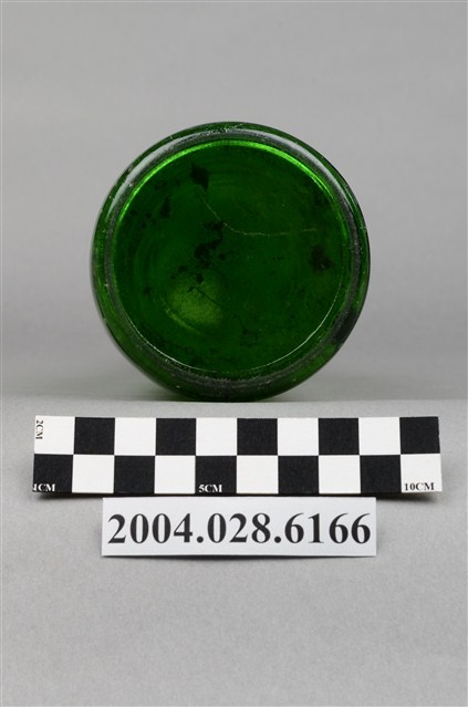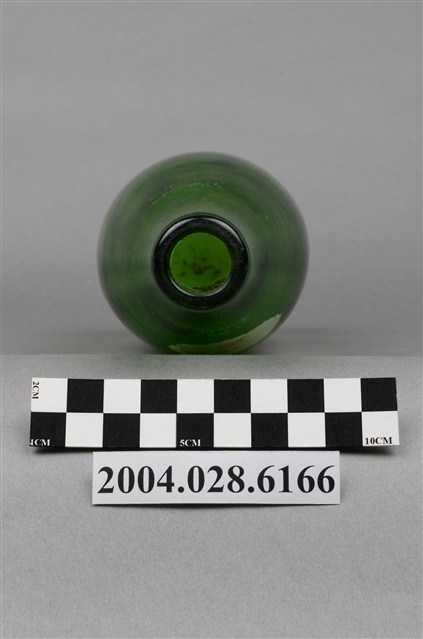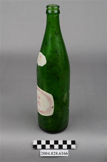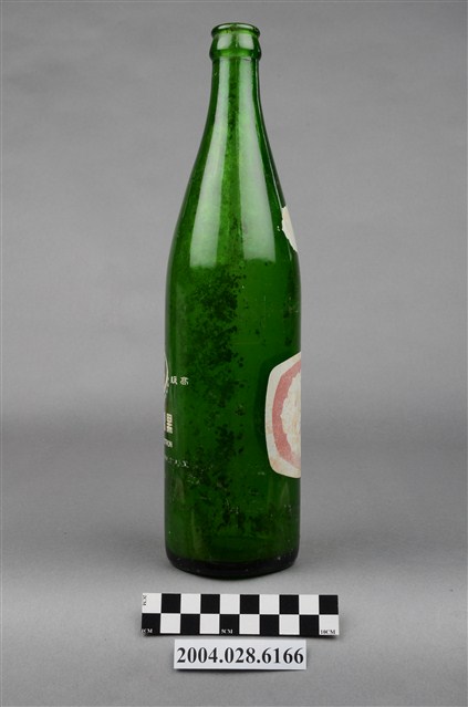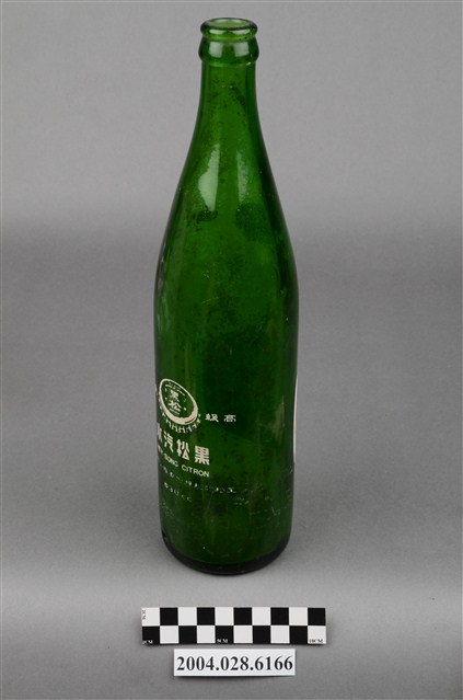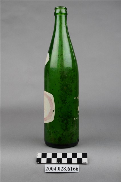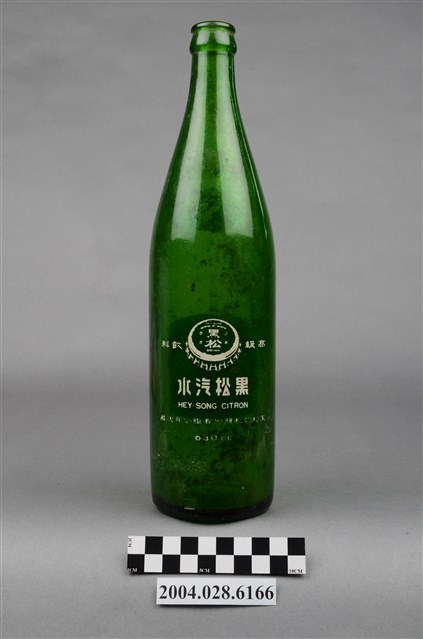 1.此件玻璃汽水瓶由深綠色玻璃製成,長約7.6公分,寬約7.5公分,高約28.8公分。瓶口有收邊,往下有一圈突起,瓶頸溜肩,至瓶身後直筒到瓶底,瓶身內部有髒污痕跡。瓶頸正面印著八菱鏡形狀的白底紅字「黑松」字樣。瓶身印著黑松飲料股份有限公司的標誌,標誌白色外圈,紅底上有白色八菱鏡標誌,內印著「HEY-SONG」、「黑松」、「註冊商標」、「CITRON」字樣。瓶身背面用白色印著黑松註冊商標與「黑松汽水」、「HEY-SONG CITRON」、「黑松飲料股份有限公司出品」、「630cc」字樣。2.臺灣在早期民生用器具多由陶、瓷製成,直到日治時期受總督府西化、現代化的影響下,引進與開發玻璃產業,玻璃製的日常用品才漸普及於社會大眾。此件汽水瓶的商標為黑松股份有限公司於1974年至1976年間的註冊商標,當時為強調主打飲料市場,便以皇冠式瓶蓋作為註冊商標的構圖,並更名為黑松飲料股份有限公司,英文名稱由「HE-SUNG」改為「HEY-SONG」。