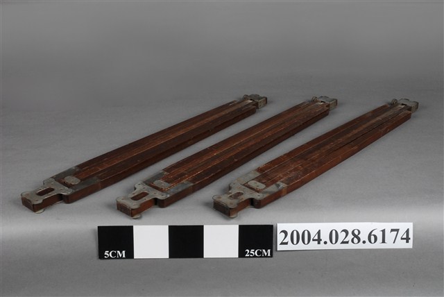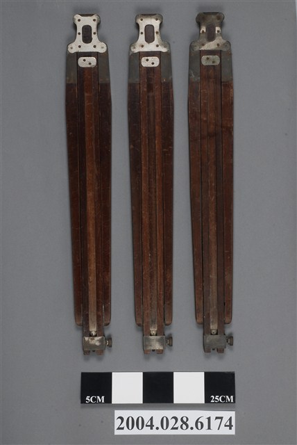 本組藏品是室外用相機伸縮三腳架,木製,呈深咖啡色,一組三件。木製伸縮腿為三截式設計,可依需要伸縮調整高度,伸縮關節處均包覆金屬以強化卡榫固定。使用時將上端勾在相機下方所附之可轉動圓盤上,便可固定相機進行拍攝。木製三角架為早年生產的攝影工具,現在多以堅固耐用之鋁合金或是講究輕便的碳纖維材質製作。螺絲皆為{一字}型,估計當年由人工一一組裝鎖上 ,金屬零件互相連接觸為鉚釘。