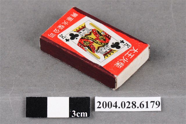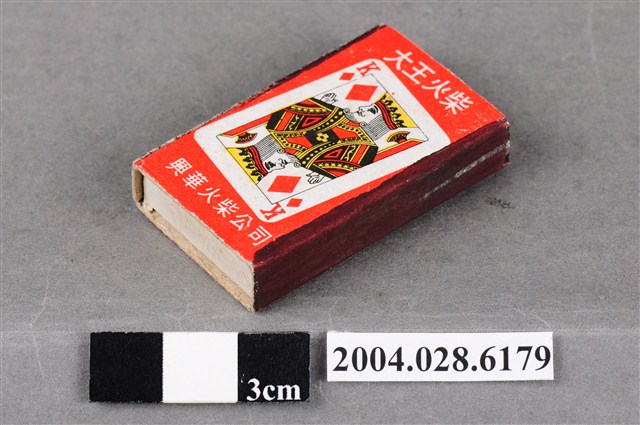 本物件為大王火柴梅花K菱形K圖樣火柴盒,內含火柴棒,外部有撲克牌中的梅花K菱形K圖樣 2.火柴又稱為「洋火」、「番仔火」,透過摩擦火柴頭和火柴盒的磷面產生火苗,在打火機和瓦斯不普遍的年代,火柴是不可或缺的民生用品,由於使用率高一般商家也將火柴盒印上廣告達到宣傳效果。