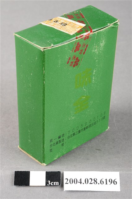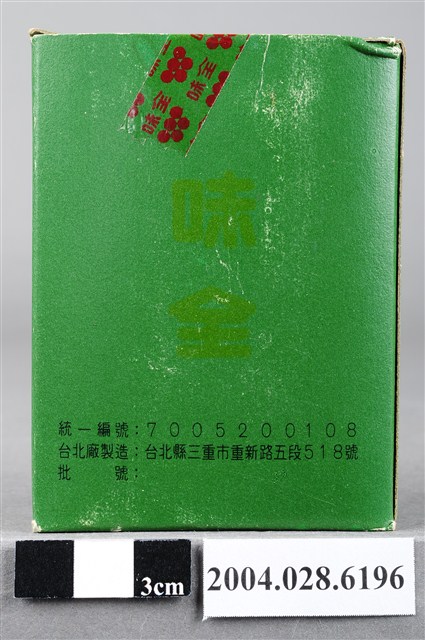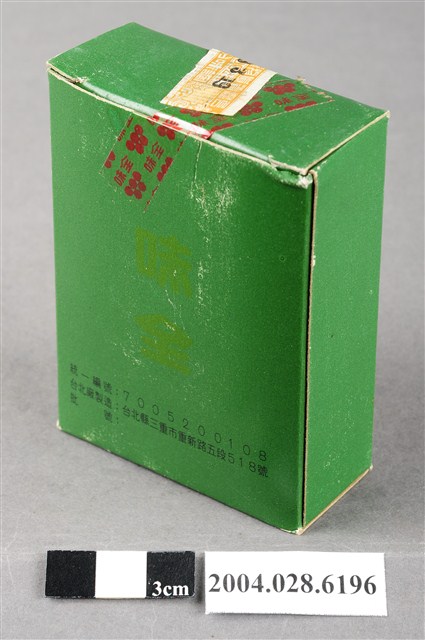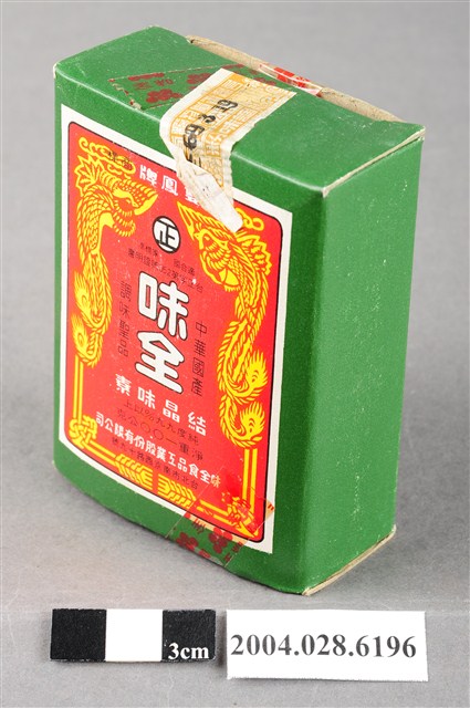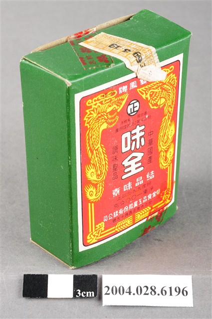 本件味全食品工業股份有限公司製雙鳳牌味全結晶味素為紙盒包裝,表面作彩色印刷,呈長6.4公分,寬8.6公分,高3公分之直式扁身長方盒。盒面通身以綠色為底色,僅正面作版面設計,以帶有白邊黑框紅底為版面,左右側以黃色裝飾鳳凰圖樣,下端兩角為中國結裝飾,底緣結穗。上端中央印有白字「雙鳳牌」,下接正字標記。中央處印有「味全」,左右兩側帶有「中華國產,調味聖品」,下接「結晶味素」商品名稱,底緣處則為公司名稱與地址。背面中央印有淺綠色「味全」暗紋,並標示有製造廠地址。上下開口皆以帶有味全標誌之透明膠帶封口,另黏貼有臺灣省貨物稅查驗證封緘,並打印有「味全 69.3.19」。