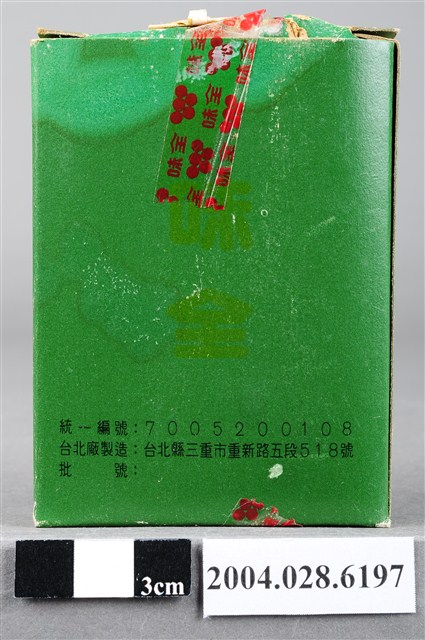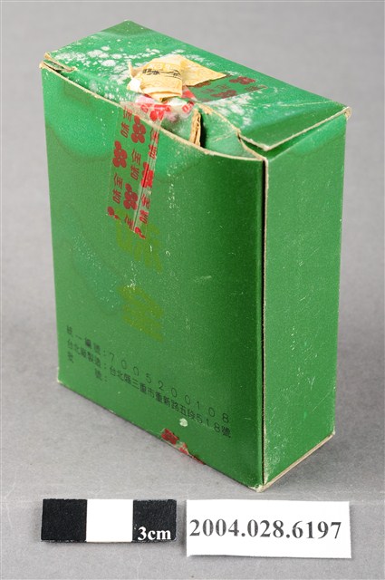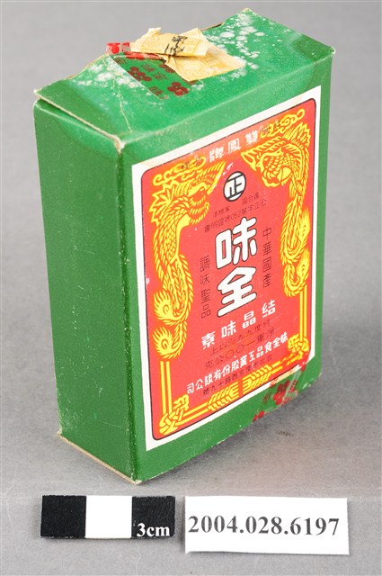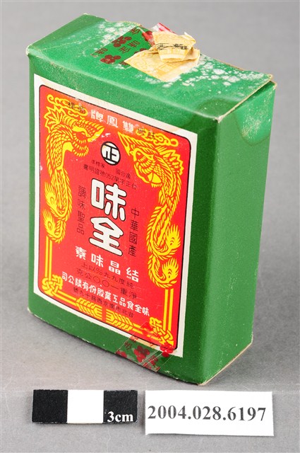 本件味全食品工業股份有限公司製雙鳳牌味全結晶味素為紙盒包裝,表面作彩色印刷,呈長6.5公分,寬8.8公分,高2.9公分之直式扁身長方盒。盒面通身以綠色為底色,僅正面作版面設計,以帶有白邊黑框紅底為版面,左右側以黃色裝飾鳳凰圖樣,下端兩角為中國結裝飾,底緣結穗。上端中央印有白字「雙鳳牌」,下接正字標記。中央處印有「味全」,左右兩側帶有「中華國產,調味聖品」,下接「結晶味素」商品名稱,底緣處則為公司名稱與地址。背面中央印有淺綠色「味全」暗紋,並標示有製造廠地址。上下開口皆以帶有味全標誌之透明膠帶封口,另黏貼有臺灣省貨物稅查驗證封緘,上開口處帶有水漬痕跡與白色點狀結晶。