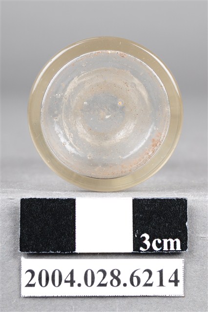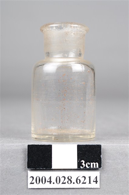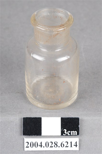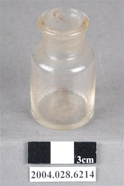 1.本件玻璃廣口藥瓶,透明玻璃製,玻璃有少許氣泡與顆粒,圓柱形瓶身,底部直徑約3公分,窄瓶肩,瓶肩與瓶頸交界處近垂直,瓶口寬廣,唇圈圓潤,瓶頸內壁有磨砂處理,瓶身內壁分佈許多細小的棕色點狀污漬。2.日治時代政府大力扶植西醫,建立西醫制度,培養西醫人才,西醫遂取代漢醫成為臺灣醫療主體。3.日治時期之前,臺灣即有以坩鍋爐吹製玻璃民生用品,惟規模不大,日治時代起便陸續有日人來臺投資設廠或協助經營玻璃產製及內外銷,1939年日本人在新竹赤土崎設立臺灣高級硝子工業株式會社,以坩鍋窯量產醫療用玻璃器皿及玻璃理化儀器,並培養吹製人才,帶動了整個產業的發展,二戰後因玻璃用品需求大增,1950-1970年民間玻璃產業十分蓬勃,1970年後因石化工業興起,塑膠製品普及、產業外移等因素而沒落。