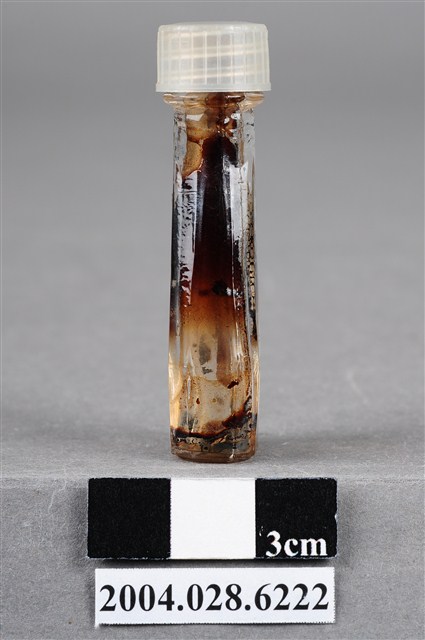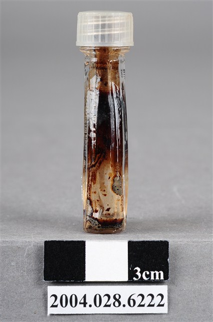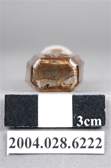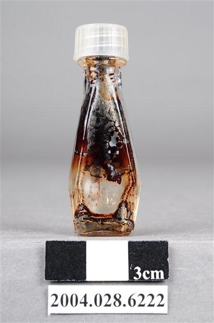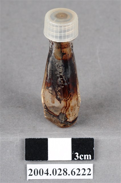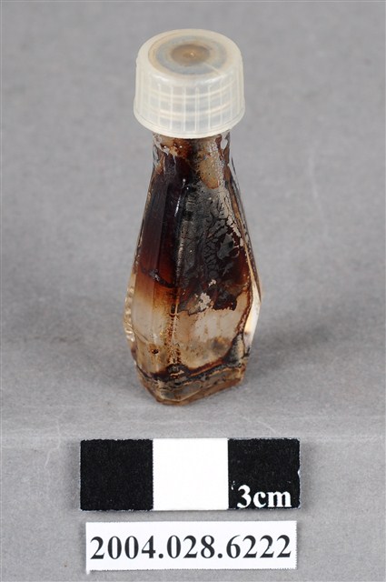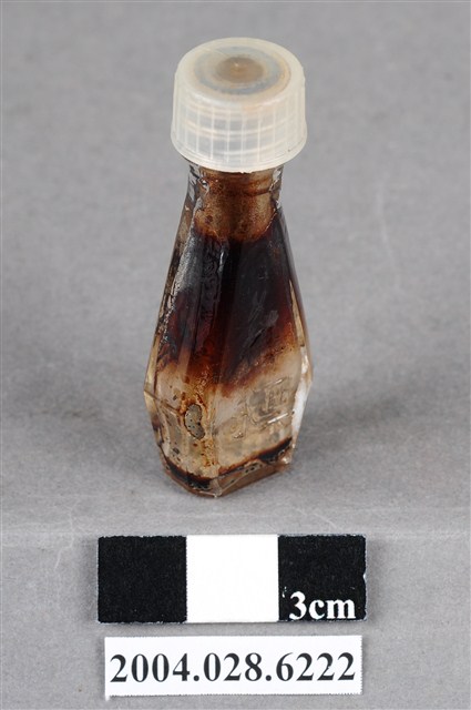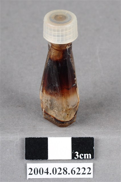 本物件為牛標玻璃藥瓶。瓶身透明無色,有牛標之凸起字樣,有蓋。瓶內有深色物質。