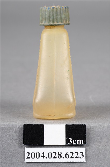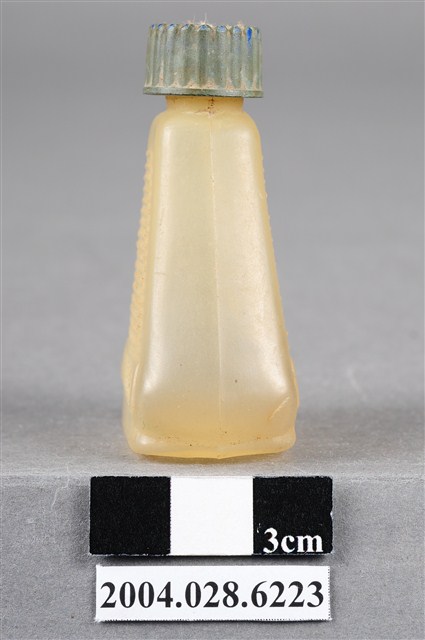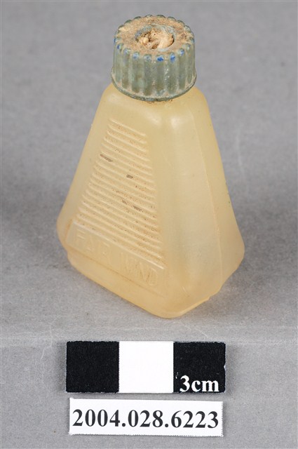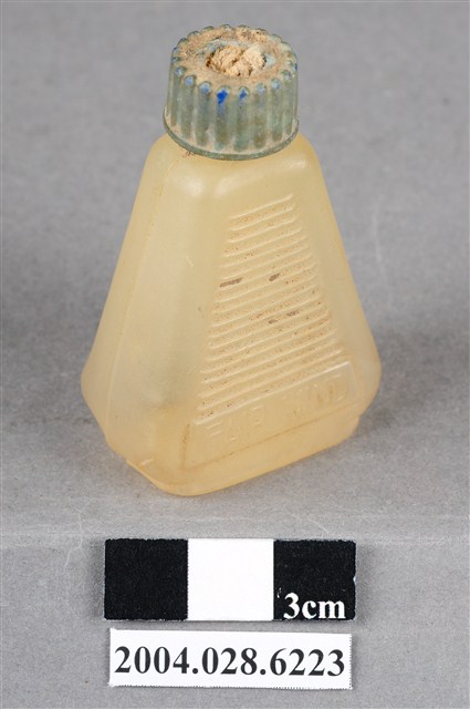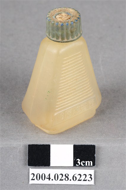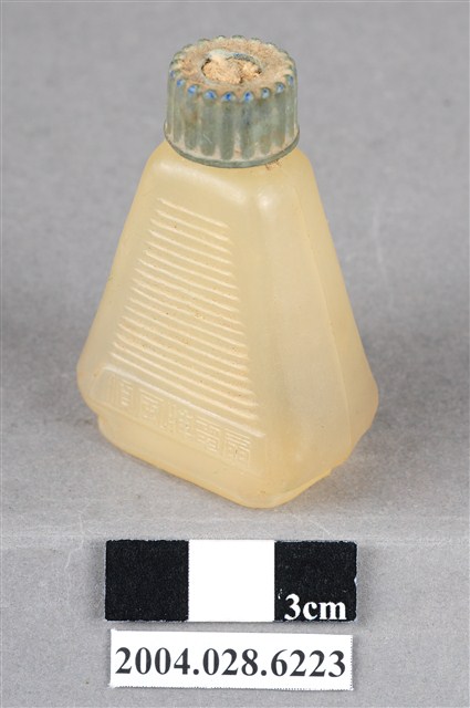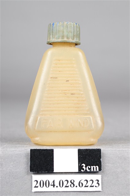 1.本物件為附藍色瓶蓋之小塑膠罐,瓶身有「順風牌電扇與FAIR WIND」字樣,並有止滑凹痕設計,推測應是作為潤滑油容器之用。 2.潤滑劑用來減少兩零件互相接觸並減低摩擦阻力,主要功能為減少摩擦並冷卻零件。 3.於臺南起家的順風工業股份有限公司於1950年代開始推出電扇及其相關產品。