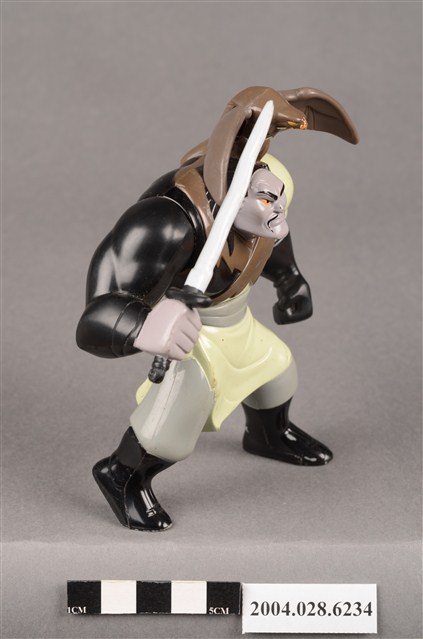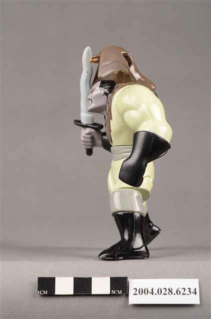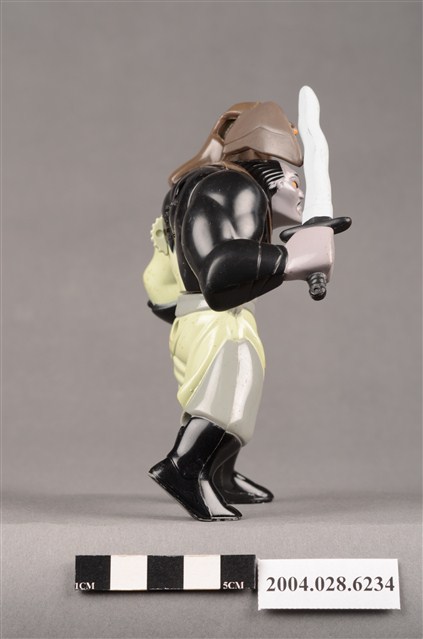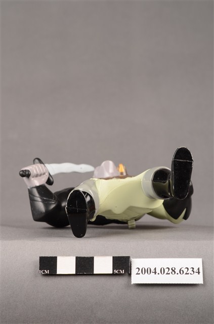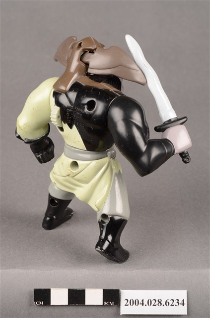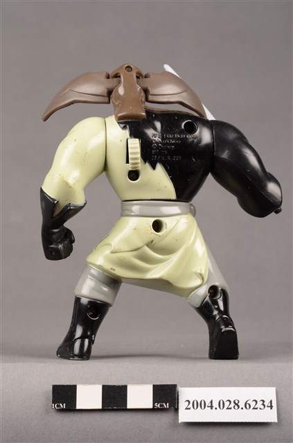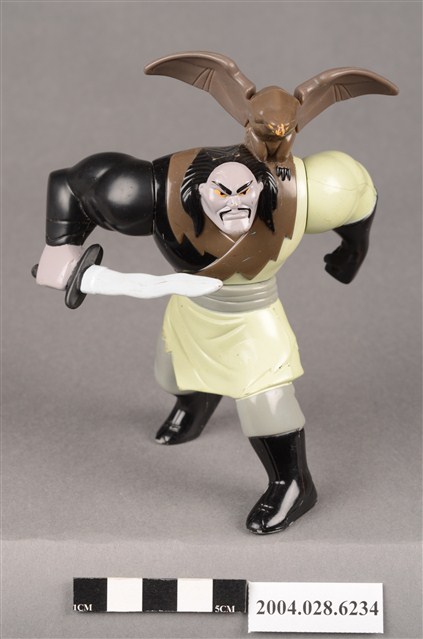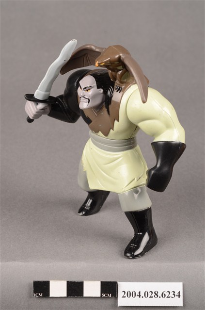 1.本物件為麥當勞花木蘭之單于玩具,材質為塑膠,人物為動畫花木蘭中的匈奴人單于,身上穿著米色、灰色、黑色的衣服,左手戴著一隻黑色手套,物件右手持了一把劍,肩上停了一隻褐色猛禽,上下撥動背後的卡榫就能讓猛禽的翅膀上下活動。本件與登錄號2004.028.6233藏品相同。