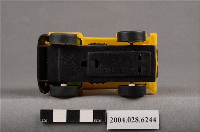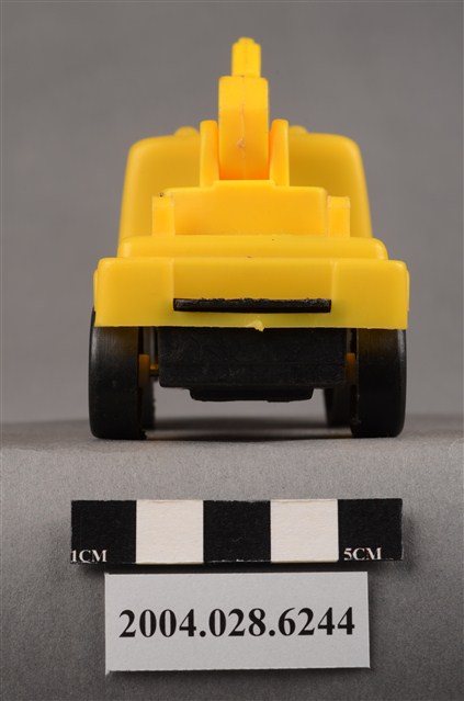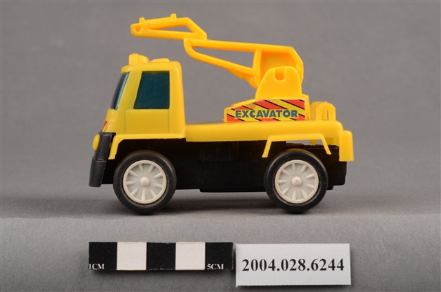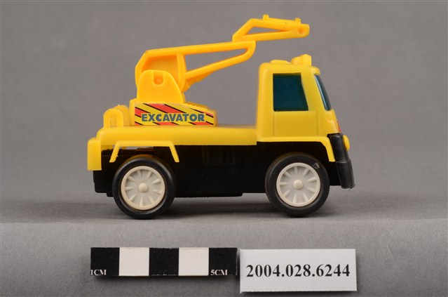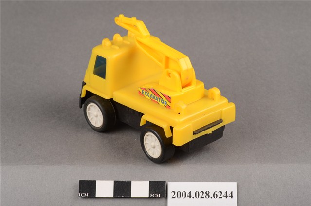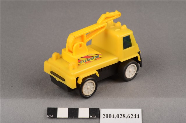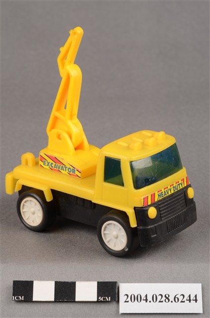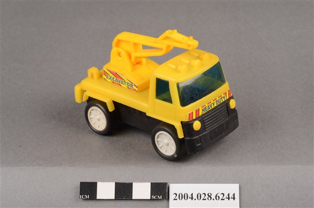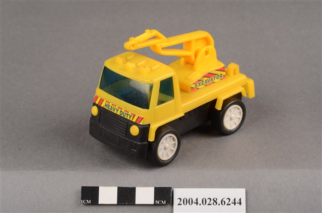 本物件為黃挖土機玩具,材質為塑膠,車體上方為黃色、下方為黑色,車窗為黑色,車頭寫有「HEAVY DUTY」字樣,並在字下方貼有紅、黃色警示線,在挖土機基座兩面貼有「EXCAVATOR」字樣,並在字下方貼有紅、黃色警示線。車底有鑰匙的浮雕並寫有「金钥匙」、「MADE IN CHINA」字樣。
