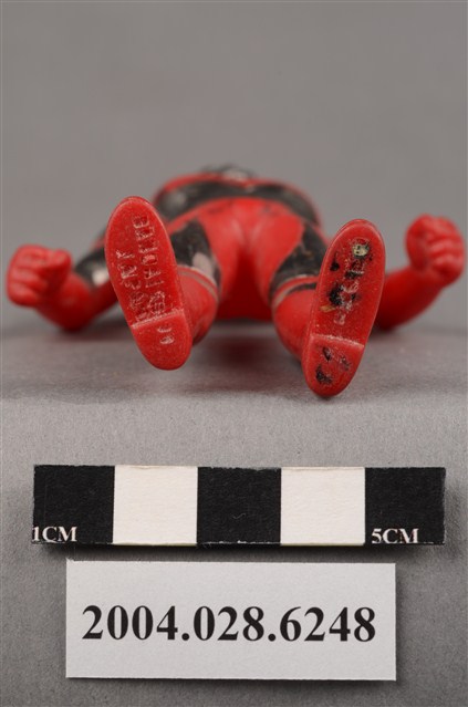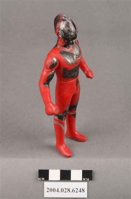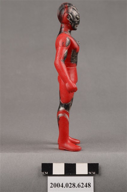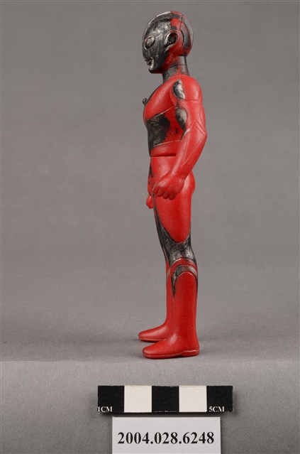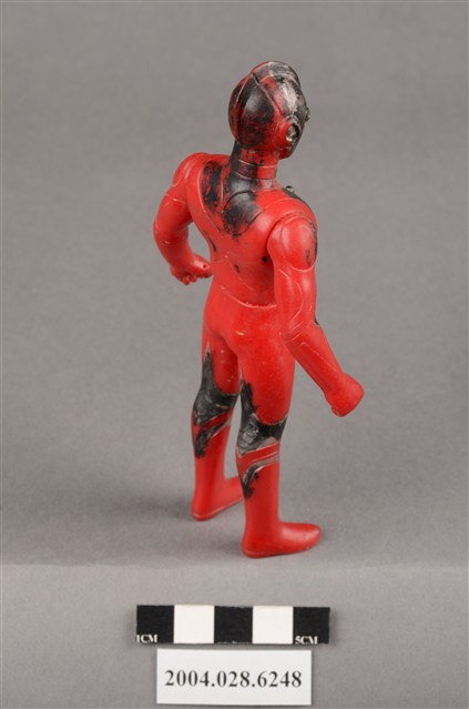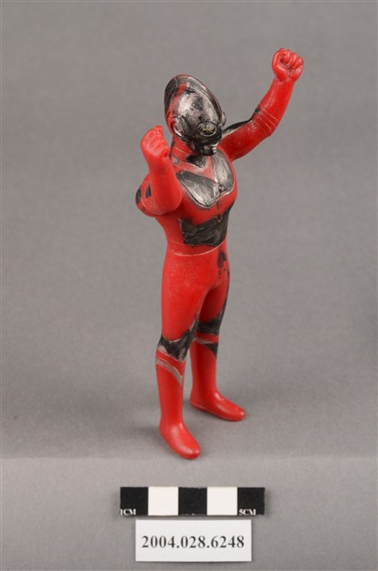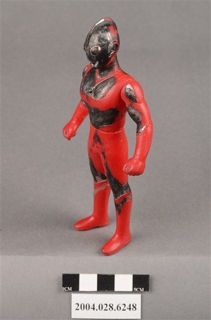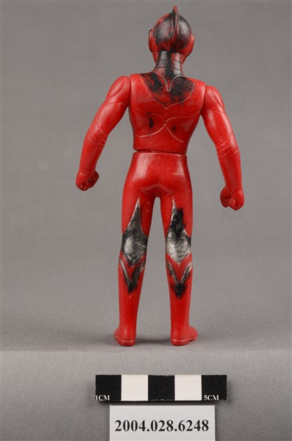 1.本物件為萬代鹹蛋超人(超人力霸王)玩具,材質為塑膠,整體為紅色,呈握拳站姿,物件頭部皆為黑色,頭中間有一條凸起物延伸至後腦杓,頸部有帶狀V字黑色條紋延伸至背後,胸、腹、手臂、肩膀、膝上、膝後皆有黑色條紋,膝下有部分為銀色條紋,推測條紋應原為銀色,後被簽字筆汙損。腳上印有「BANDAI」、「JAPAN」等字樣。