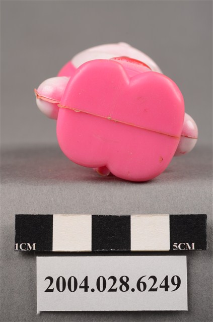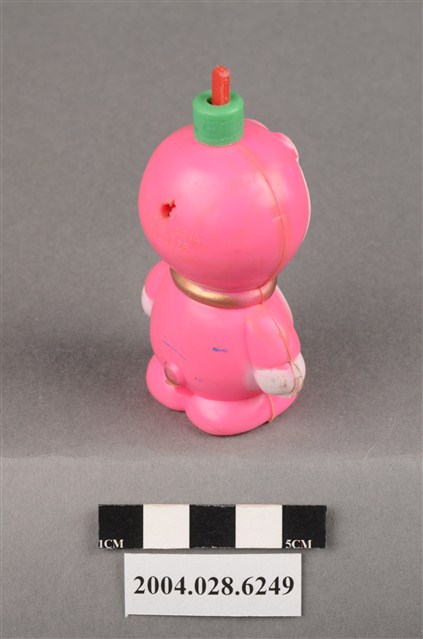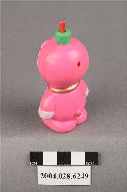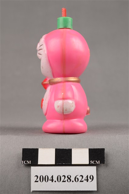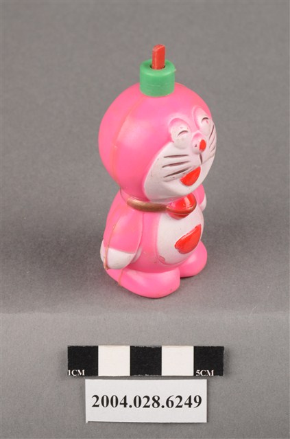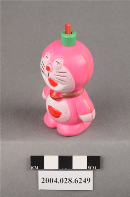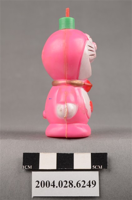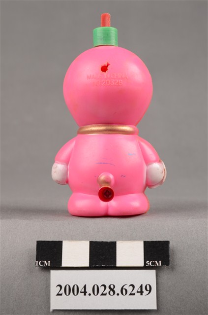 1.本物件為粉色小叮噹玩具,材質為塑膠,整體除了肚子、手與臉部外多為粉紅色,頭上綠色塑膠環,環中有根紅色塑膠棒,物件脖子上頸圈為金色,鈴鐺為紅色、百寶袋為紅色,背後印有「MADE IN CHINA」、「NO:20328」字樣。