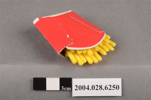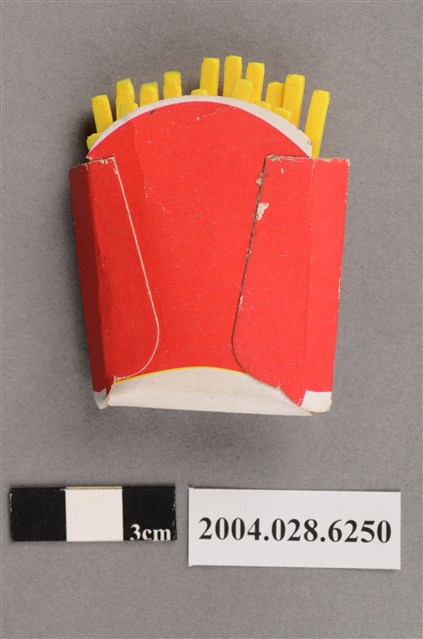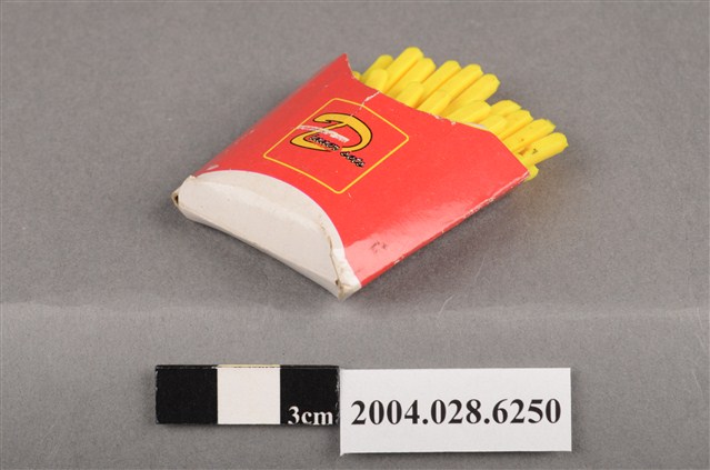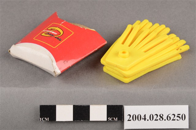 本物件為薯條玩具,材質為紙、塑膠,外觀為紅色白底紙製薯條盒中裝著黃色塑膠薯條,外盒上寫著「Dinner sets」,其中「D」字為黃底黑邊,其他字為白底黑邊,塑膠薯條為片狀,共有四片,塑膠片中間有卡榫可以連結四片薯條。