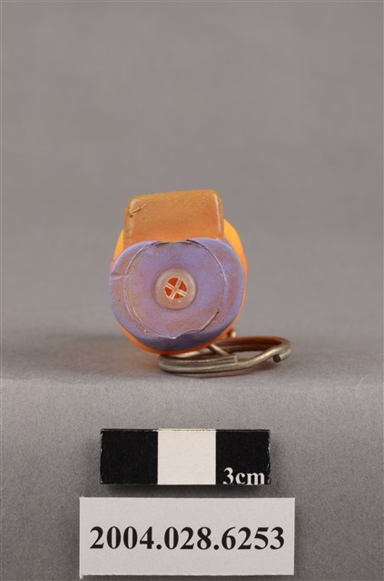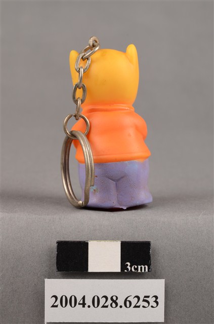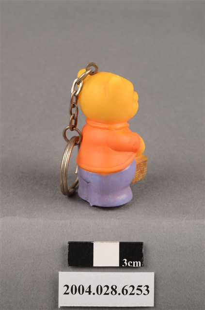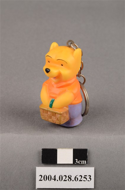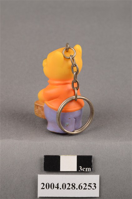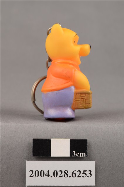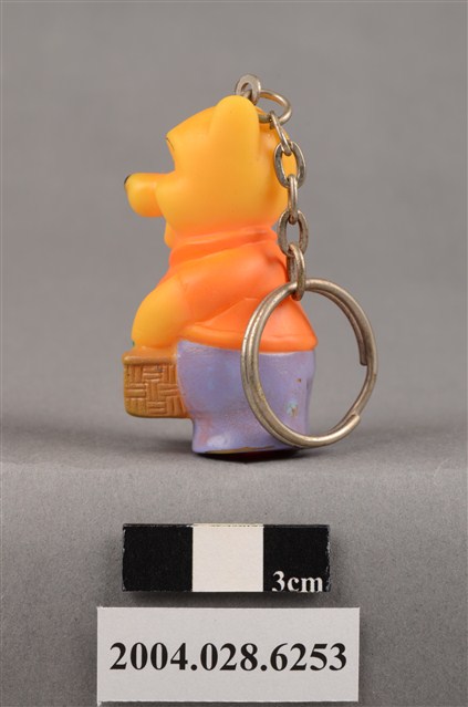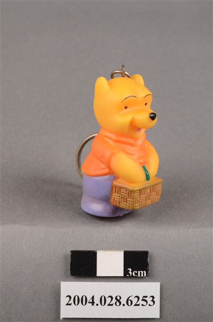 1.本物件為小熊維尼鑰匙圈,材質為塑膠,小熊維尼身著橘色短袖帽T與藍紫色長褲,雙手擺於身體前方,提有咖啡色提籃。鑰匙圈為銀色,且鑰匙圈短鏈嵌於小熊維尼頭頂。