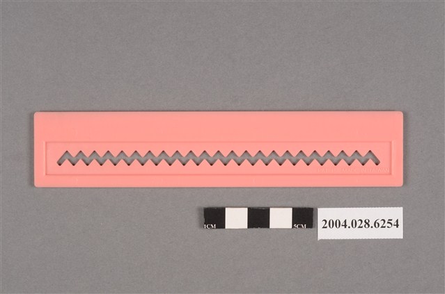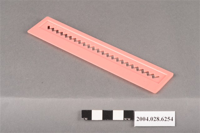 本文物為塑膠製文具用尺,長15公分,寬3公分,粉紅色,正面印有刻度15公分,及「SPORT DOLL」字樣;正背面均印有「MADE IN TAIWAN」。