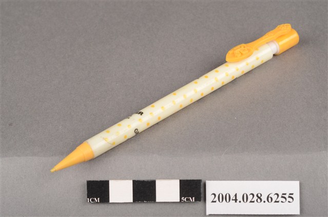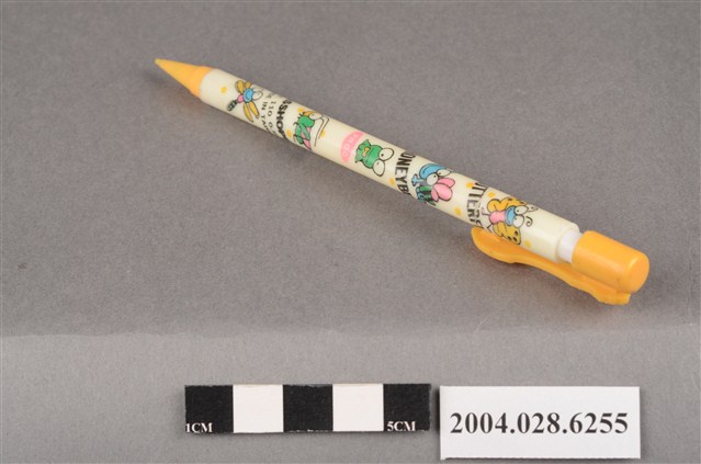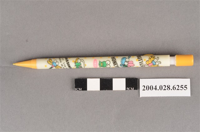 本文物為塑膠製自動鉛筆,長約15公分,黃色,筆身印有大眼蛙、蝴蝶、蜻蜓、蜜蜂、蟋蟀等圖案以及對應之英文單字,並印有英文字樣made in Taiwan。