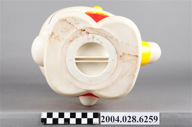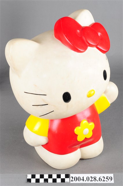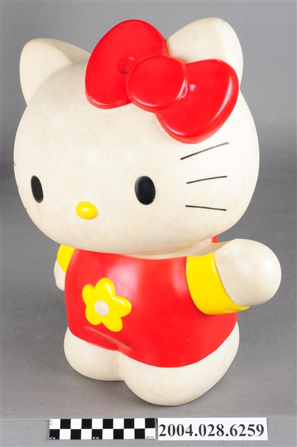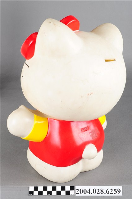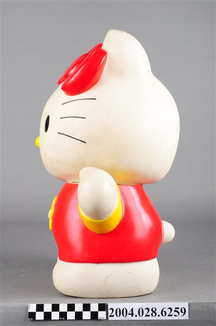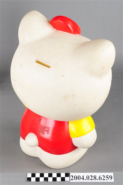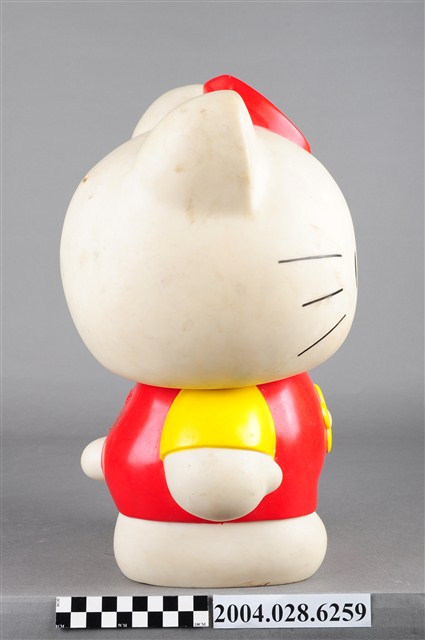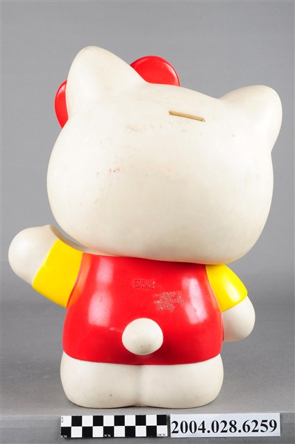 1.本物件為Hello Kitty 造型存錢筒,其左手向上舉起,頭往右側傾斜,頭上有一紅色蝴蝶結,於頭頂有一長方形開口供存錢用,身穿紅色衣服,兩側袖子為黃色,並於衣服正面印有黃色花朵圖案,衣服背面印有「©76,97 SANRIO」字樣,底部有一白色蓋子將存錢筒的洞口蓋上。