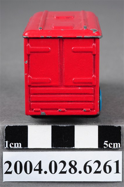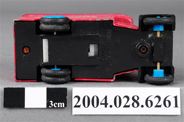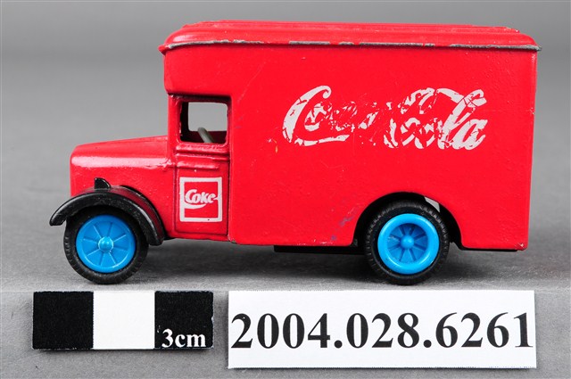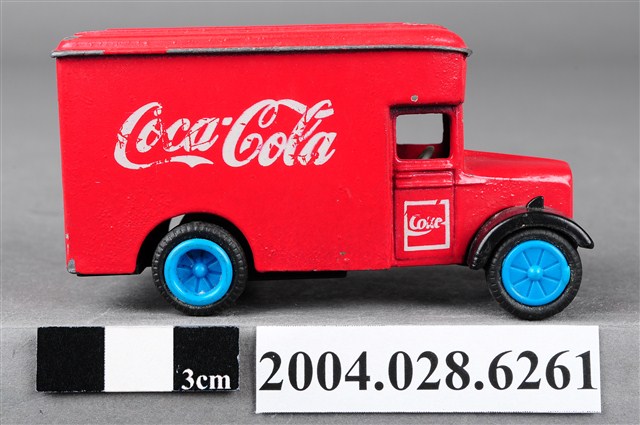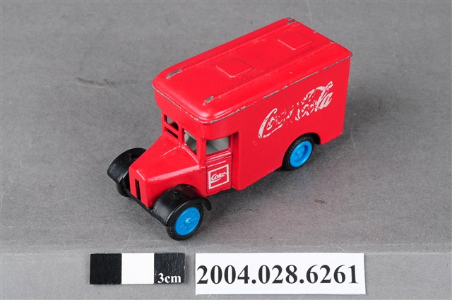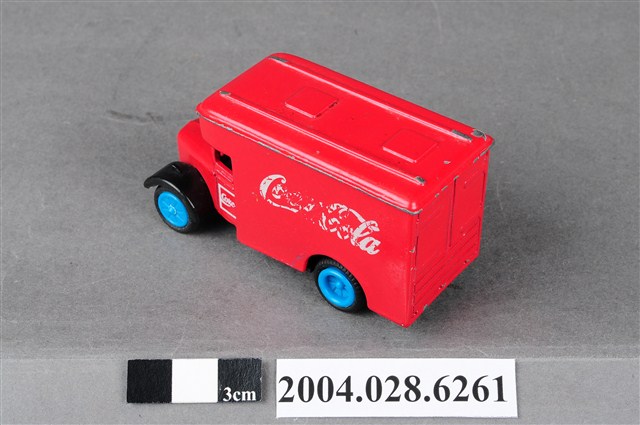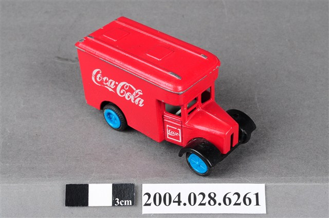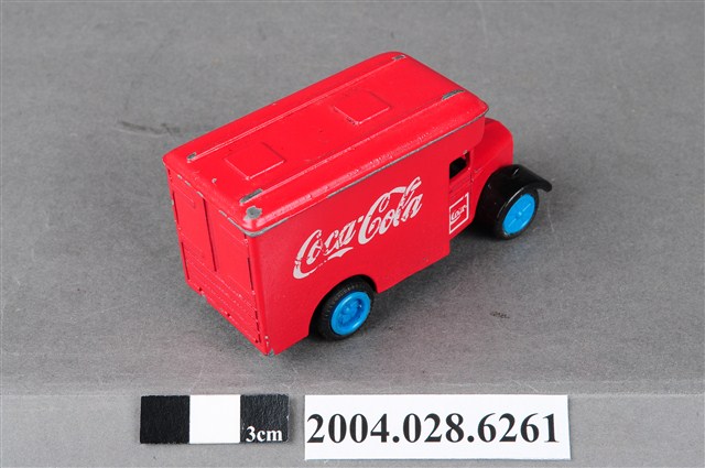 1.本物件為可口可樂玩具車,材質為金屬、塑膠,外觀為小貨車,車輛外殼皆為紅色,擋泥板與車輪為黑色,輪框為水藍色,左右車門上皆寫有「Coke」字樣,車身兩面皆寫有寫有「Coca-Cola」字樣,略為掉漆,車頂兩側有長條形突起,中間有兩個正方形凸起,車後有類似小貨車尾車門及坡道版的凹痕,車底寫有「MADE IN CHINA」、「97-02」字樣。