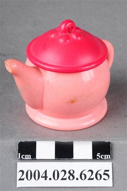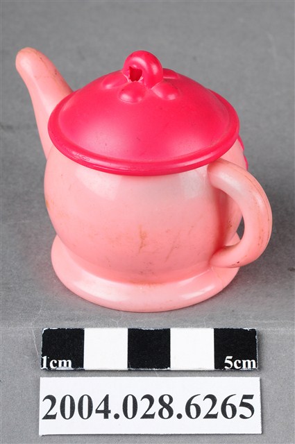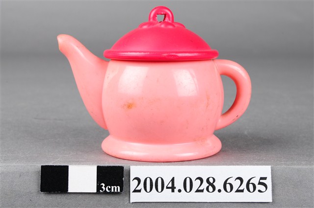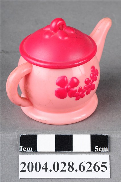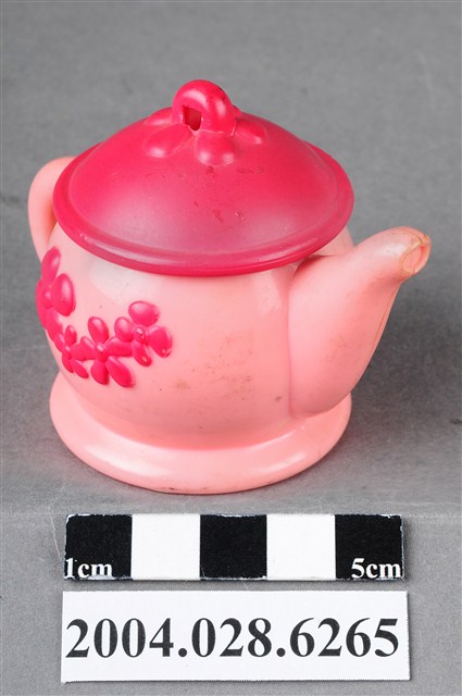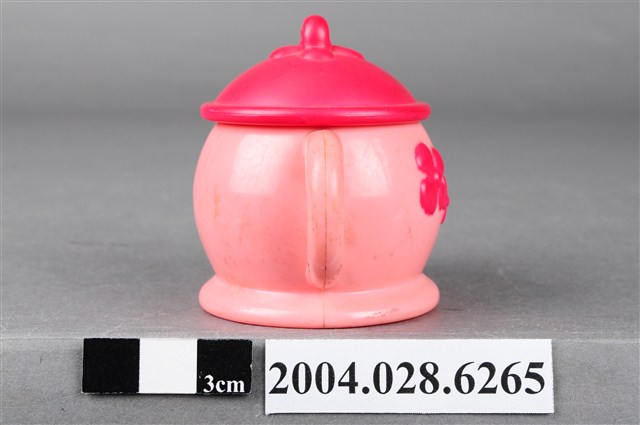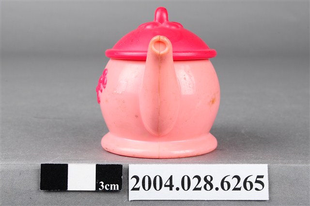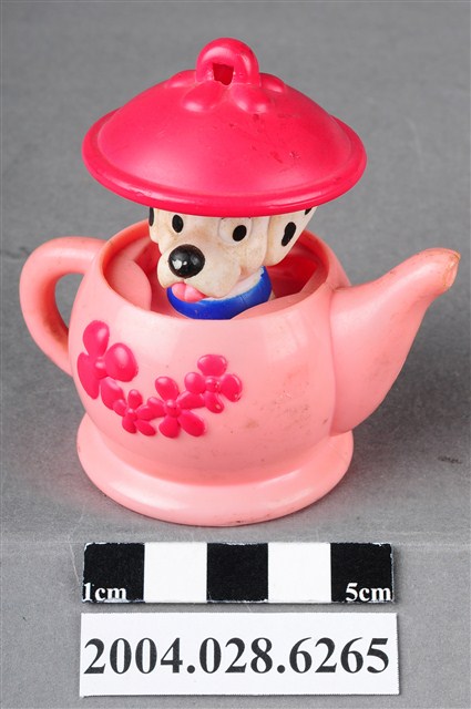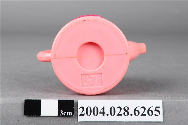 1.本物件為麥當勞101忠狗粉色茶壺玩具,材質為塑膠,茶壺身為淺粉紅色,上有4朵深粉紅色花朵浮雕,茶壺蓋為深粉紅色,壺蓋頂有花朵狀裝飾,茶壺內有一隻大麥町犬,口吐舌,頸部有藍色項圈,茶壺底寫有「Disney」、「China」、「Chine」、「HK 2-2」字樣。
