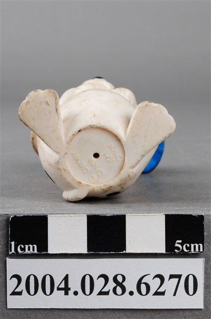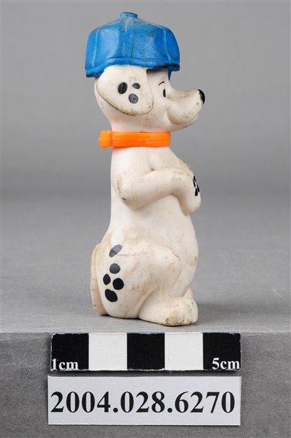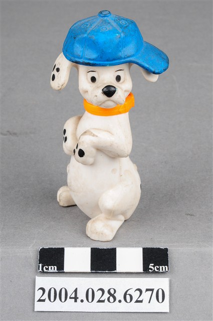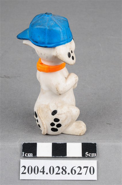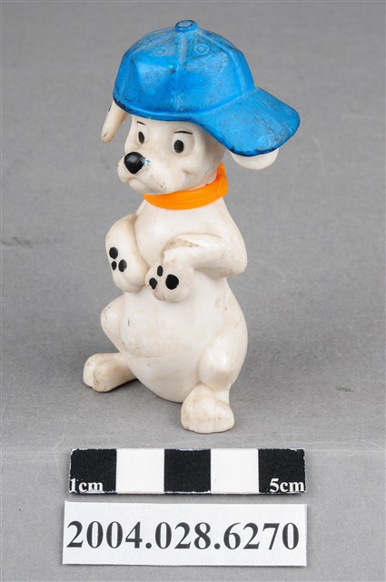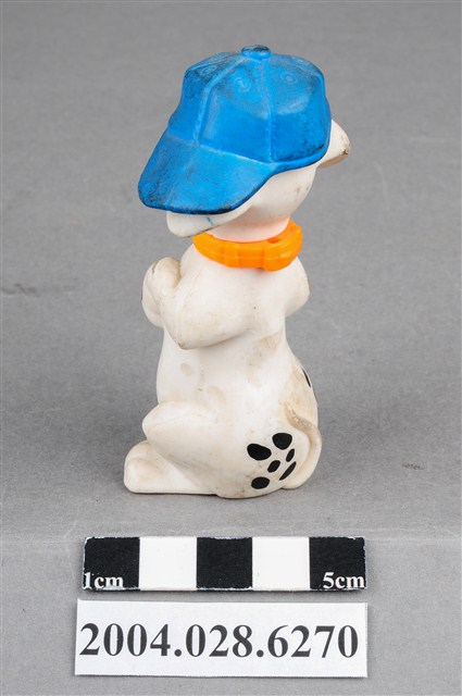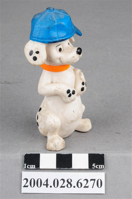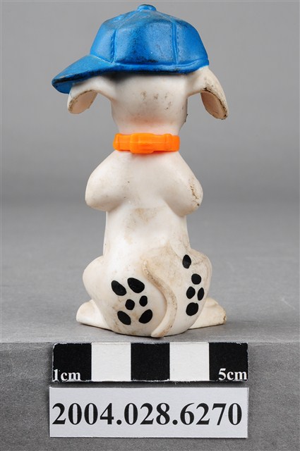 1.本物件為麥當勞101忠狗棒球帽玩具,材質為塑膠,外表為立姿大麥町犬戴著深藍色棒球帽,大麥町犬右耳上有三個黑色斑點,頸部有橘色項圈,左右前腿各有三個黑色斑點,背後有十一個黑色斑點,物件底部有「Disney」、「China」、「KH」、「Chine」字樣。