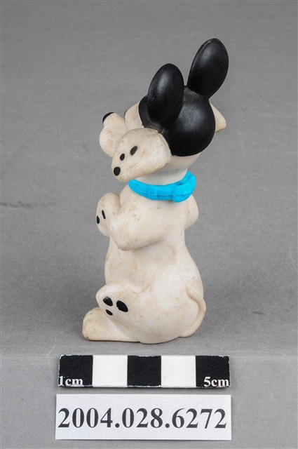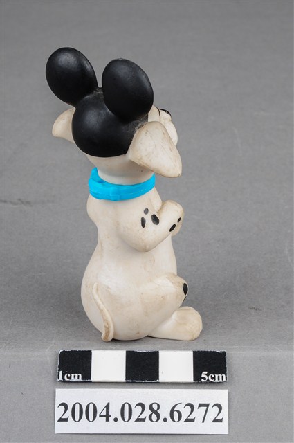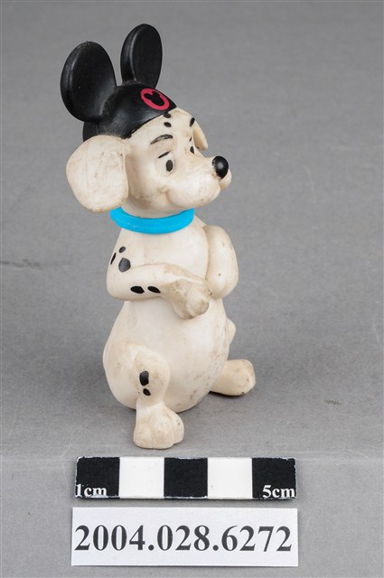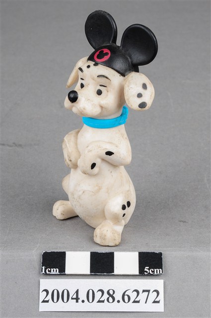 1.本物件為麥當勞101忠狗米老鼠帽玩具,材質為塑膠,外表為立姿大麥町犬戴著黑色米老鼠帽子,帽子上有黑、紅色米奇LOGO,大麥町犬臉上有兩個黑色斑點,左耳上有三個黑色斑點,頸部有藍色項圈,左右前腿縮在身體兩側,左前腿有兩個黑色斑點,右前腿有三個黑色斑點,右後腿有兩個黑色斑點,物件底部有「Disney」、「China」、「KH」、「Chine」字樣。