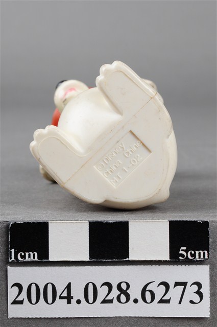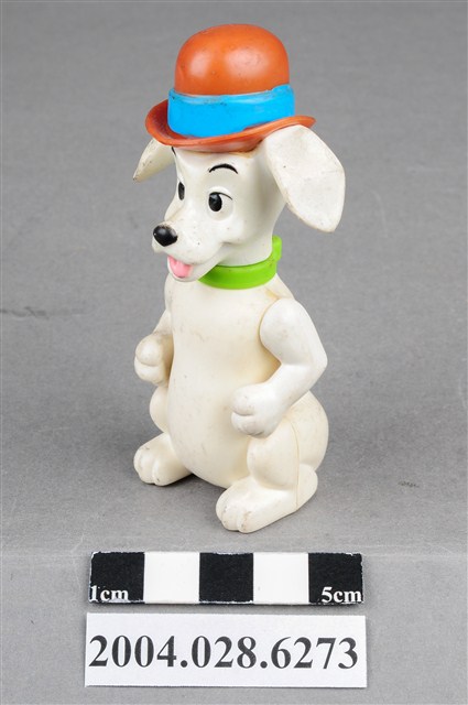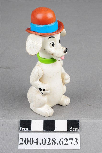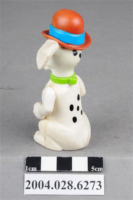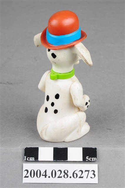 1.本物件為麥當勞101忠狗紳士帽玩具,材質為塑膠,外表為立姿大麥町犬戴著棕色紳士帽,帽子上繫著藍色緞帶,大麥町犬頭後有兩個黑色斑點,頸部有綠色項圈,右前腿有三個黑色斑點,背上有五個黑色斑點,物件底部有「Disney」、「China」、「Chine」、「MT 1-02」字樣。