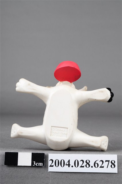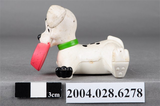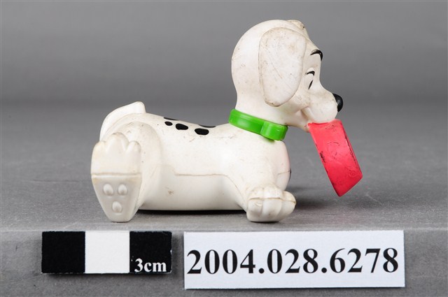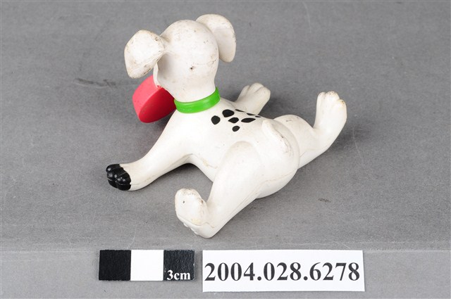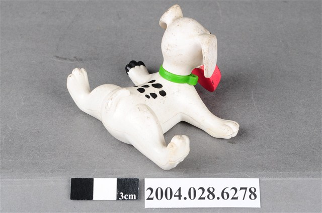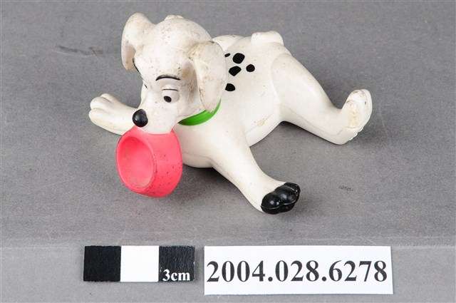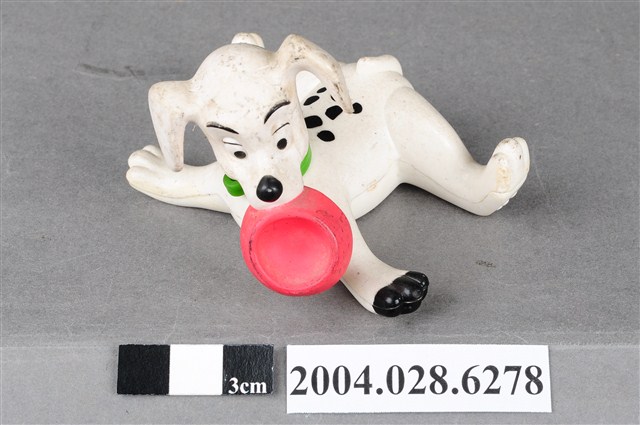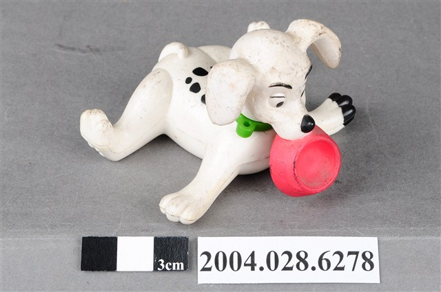 1.本物件為麥當勞101忠狗咬紅碗玩具,材質為塑膠,外表為趴姿大麥町犬嘴上咬著紅碗,大麥町犬頸部有綠色項圈,左前腿腳趾為黑色,背上有八個黑色斑點,物件底部有「Disney」、「China」、「Chine」、「GG 2-06」字樣。