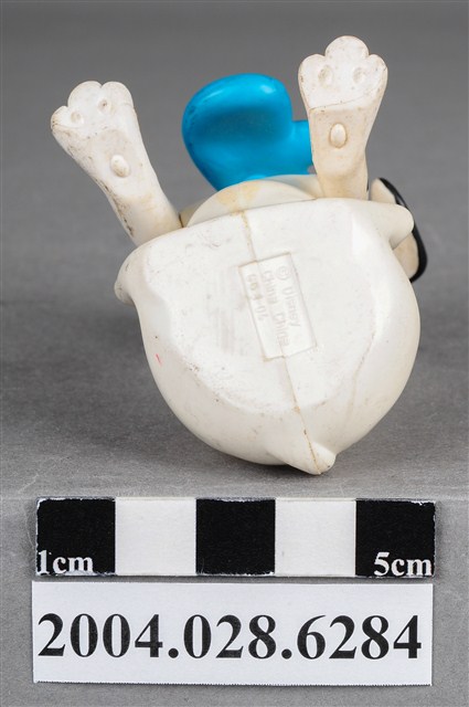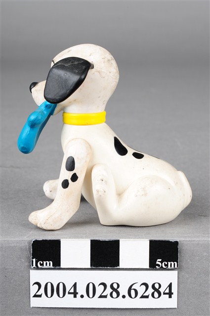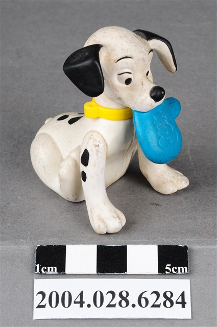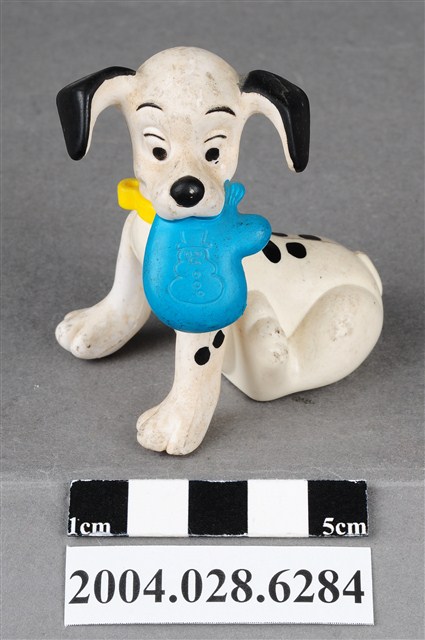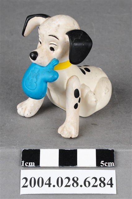 1.本物件為麥當勞101忠狗咬水藍色手套玩具,材質為塑膠,外表為坐姿大麥町犬咬著水藍色手套,手套上有雪人戴著帽子的圖案,大麥町犬左右耳背為黑色,頸部有黃色項圈,右前腿有兩個黑色斑點,左前腿有三個黑色斑點,背上有四個黑色斑點,物件底部有「Disney」、「China」、「Chine」、「GG 1-04」字樣。