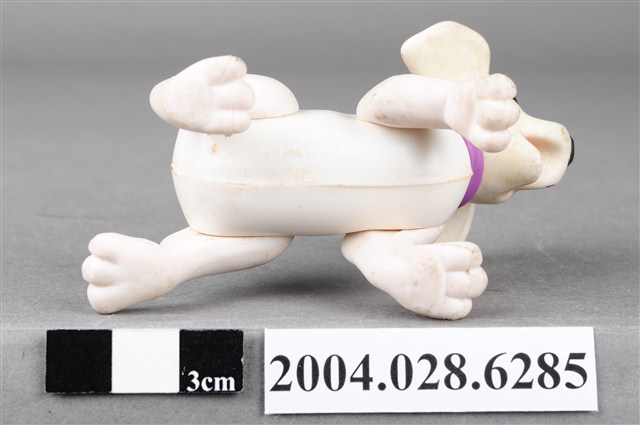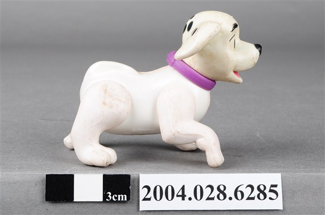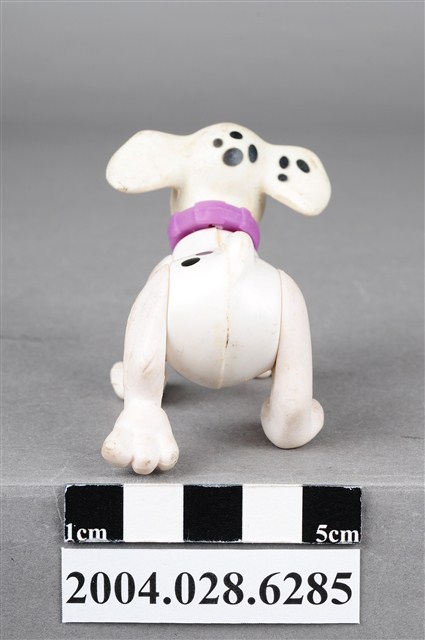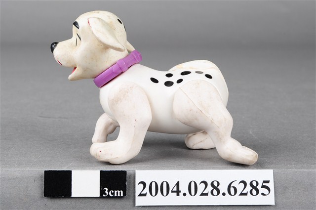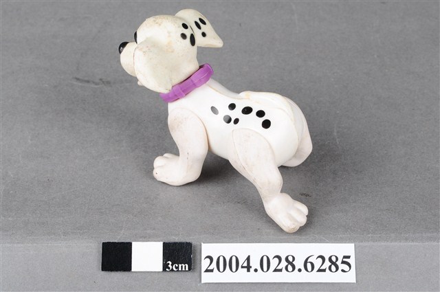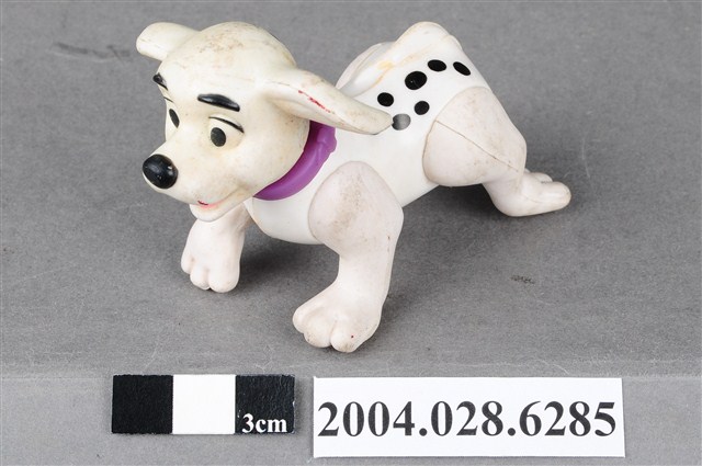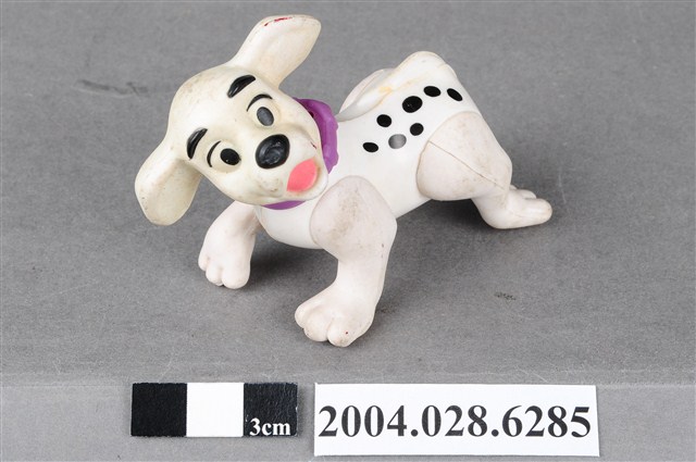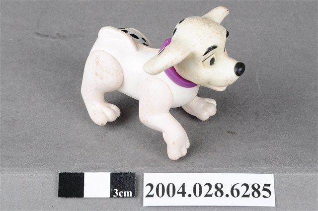 1.本物件為麥當勞101忠狗紫色項圈玩具,材質為塑膠,外表為站姿大麥町犬,頭後有四個黑色斑點,右耳上有三個黑色斑點,頸部有紫色項圈,背上有七個黑色斑點,腹部上有「Disney」、「China」、「WM」、「Chine」字樣。