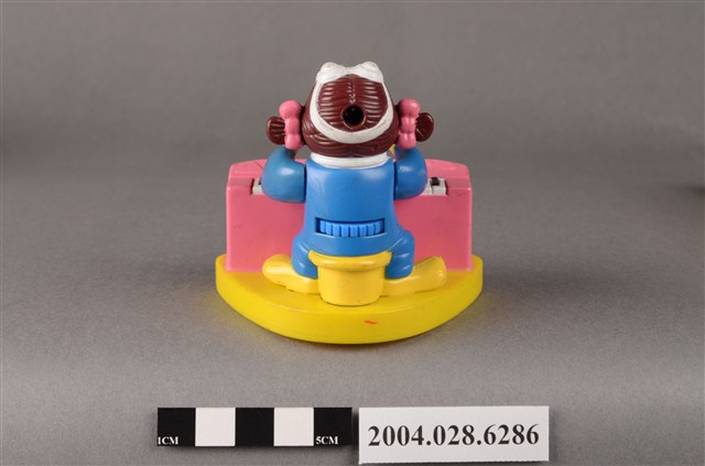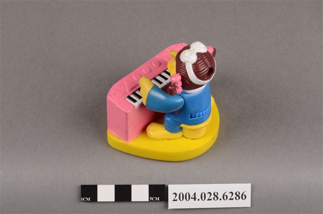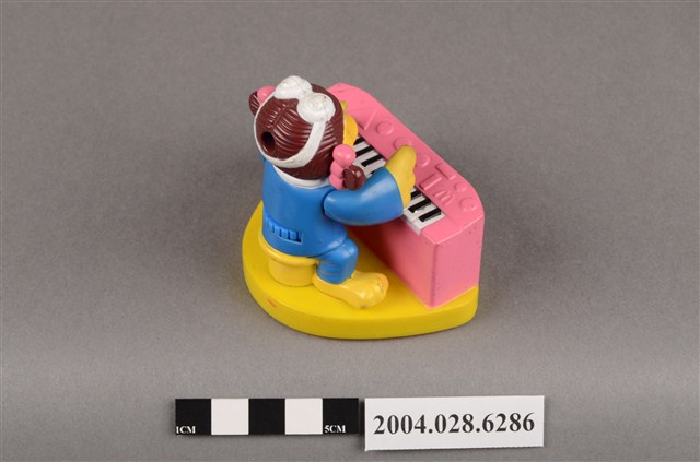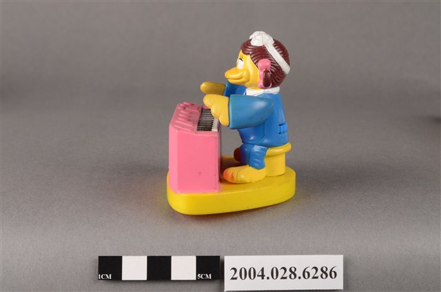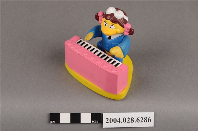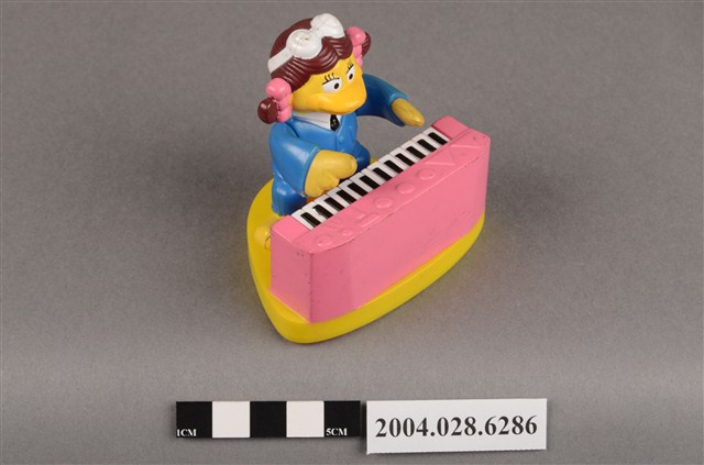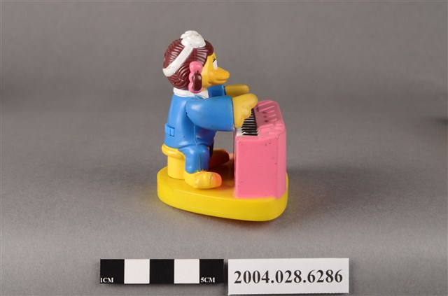 1.本物件為麥當勞大鳥姊姊鍵盤手玩具,材質為塑膠,外表為大鳥姊姊坐在粉紅色的鋼琴後方,大鳥姊姊坐在黃色椅子上,頭上繫了白絲帶,兩邊繫了粉色蝴蝶結,穿白襯衫、黑領帶、深藍色西裝,西裝口袋上有麥當勞M字LOGO,背後有可轉動的齒輪,鋼琴外表為粉紅色,表面有圓型與三角形圖案,底部有「2001 McDonald's Corp.」、「Made in China」、「402/S.S.223」、「S-MT 04」。
