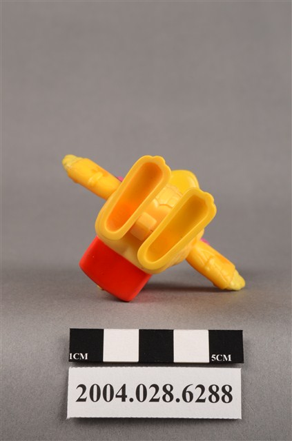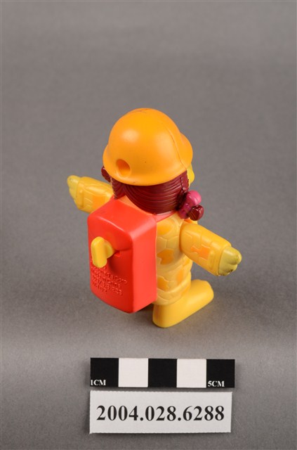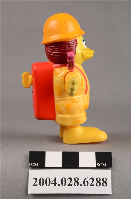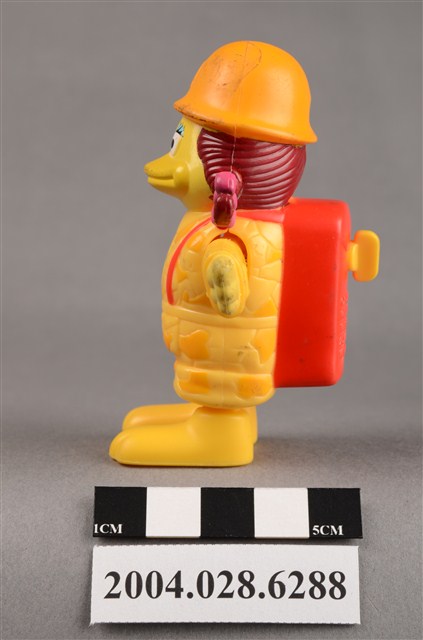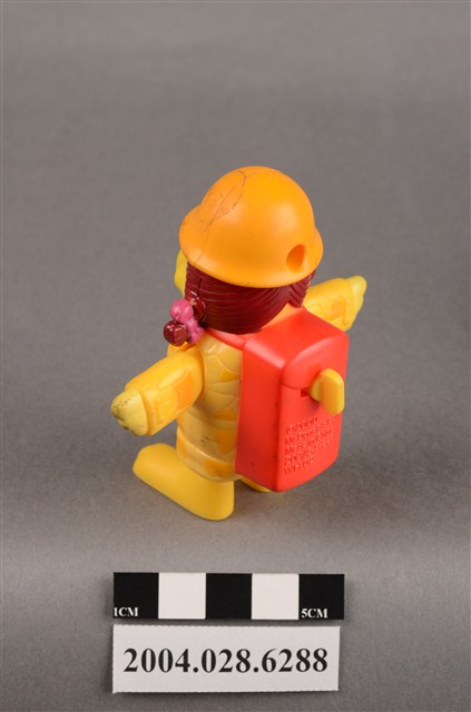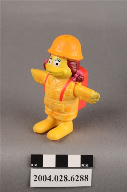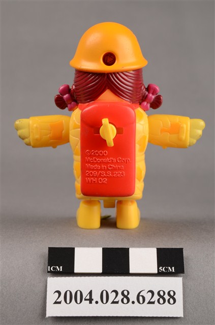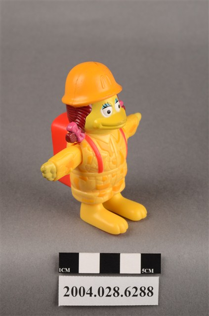 1.本物件為麥當勞大鳥姊姊走吊橋玩具,材質為塑膠,大鳥姊姊頭上兩邊繫了粉色蝴蝶結,雙手平開,身穿黃色、深黃色幾何圖案外衣,頭戴深黃色麥當勞M字LOGO安全帽,揹著紅色背包,紅色背包上有黃色旋鈕,有「2000 McDonald's Corp.」、「Made in China」、「209/S.S.223」、「WH 02」字樣,大鳥姊姊左腳底有「L3」,右腳底有「R4」字樣。