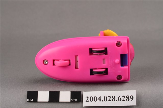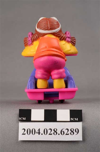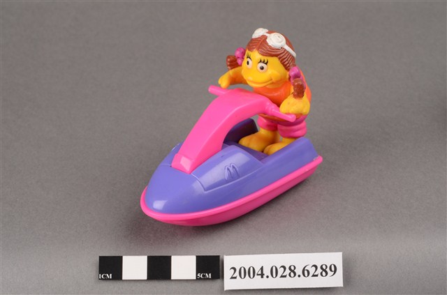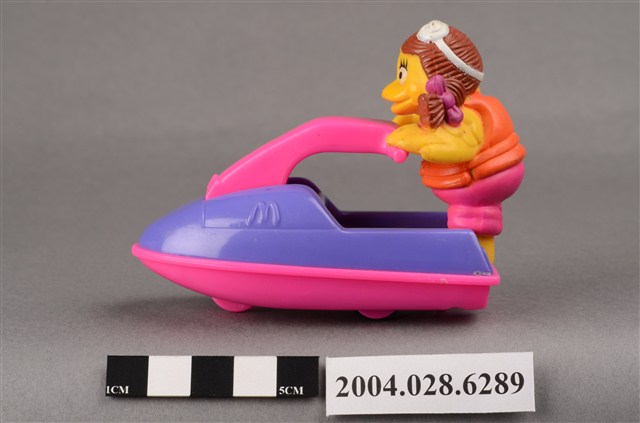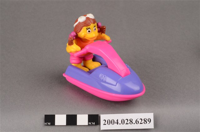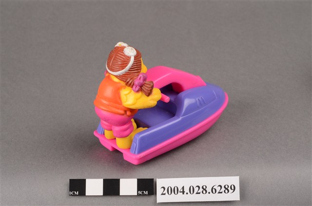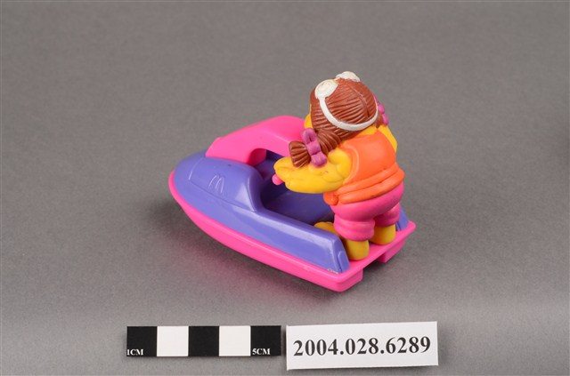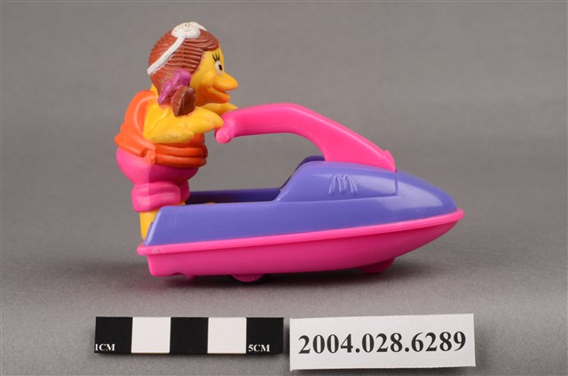 1.本物件為麥當勞大鳥姐姐水上飛快車玩具,材質為塑膠,大鳥姊姊頭上繫了白絲帶,兩邊繫了粉色蝴蝶結,身穿橘色救生衣,粉色短褲,騎著一臺粉色、紫色水上摩托車,摩托車車身兩側有麥當勞M字LOGO,車底有三個輪胎與「1999 McDonald's Corp.」、「Made in China」、「JT S.S.223/9」字樣。