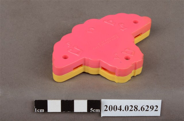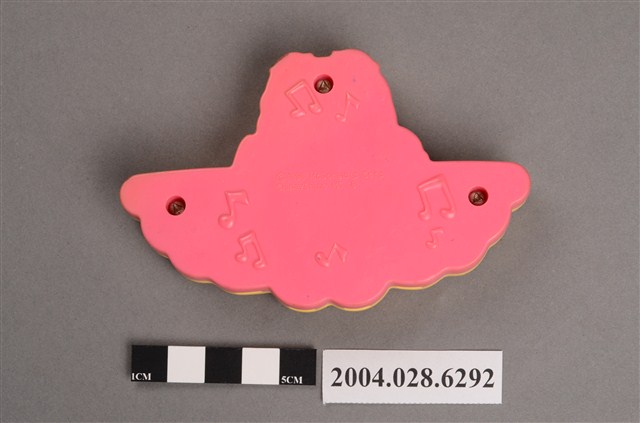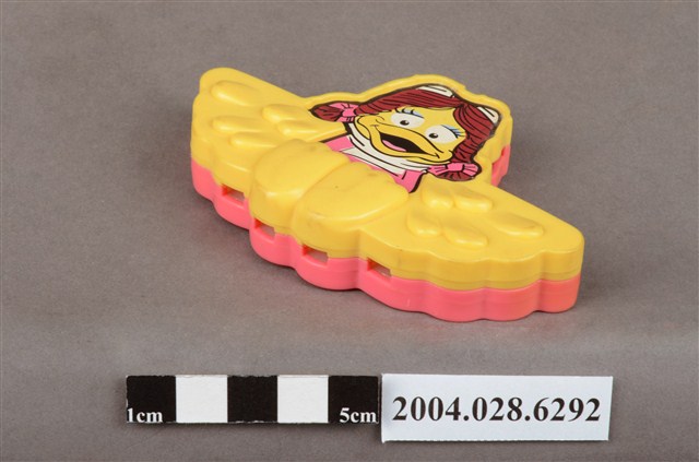1.本物件為麥當勞大鳥姊姊口琴玩具,材質為塑膠,口琴正面為黃色,背面為粉色,正面貼了大鳥姊姊圖案的貼紙,貼紙邊緣塑膠膜略有掀起,大鳥姊姊頭髮兩邊繫了粉色蝴蝶結,口琴類似大鳥姊姊雙手平開,呈坐姿,黃色塑膠上有類似羽毛及大鳥姊姊腳丫的圖案,口琴上、下方各有四個孔洞,背面則有許多音符的圖案,並有「1996 McDonald's Corp.」、「China/Chine」、「Mt 18」字樣。本件與登錄號2004.028.6291藏品相同。