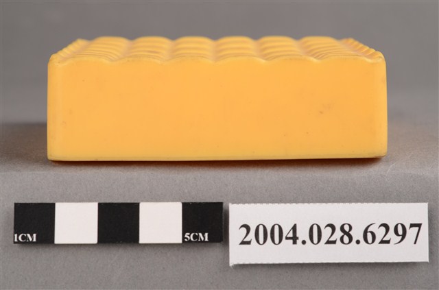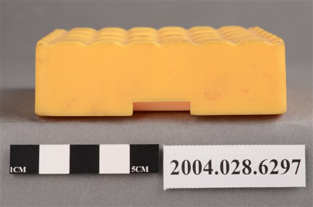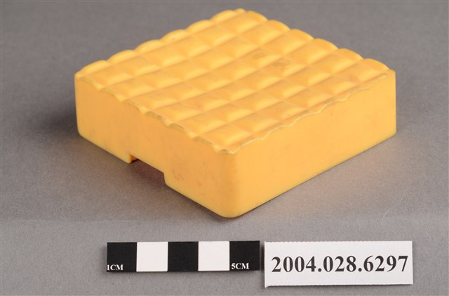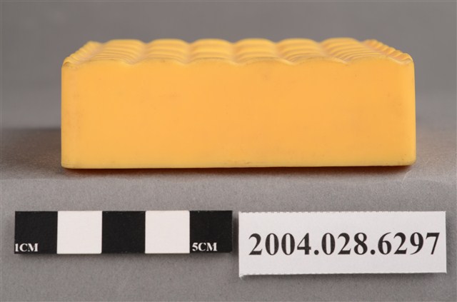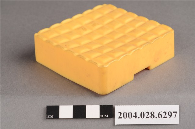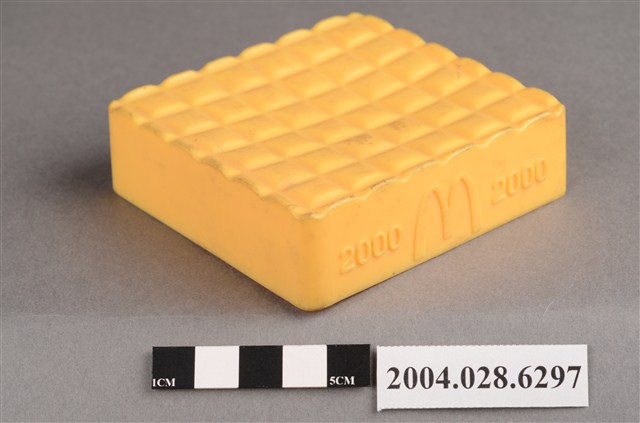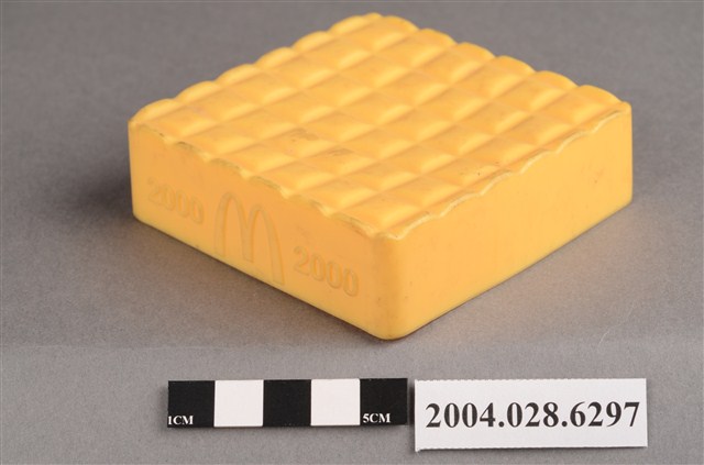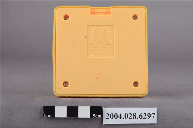 1.本物件為麥當勞黃色盒子玩具,材質為塑膠,外觀為一個黃色方盒,上方有6*6的格狀凸起,外緣為波浪狀,盒子側面有一面有麥當勞M字LOGO,LOGO兩側各有「2000」字樣,相對LOGO面的盒子側面,下方有一長方型小開口,盒子底部有麥當勞M字LOGO與「2000 McD. Corp.」、「Made in China」、「213/S.S. 223」、「WH 02」字樣。