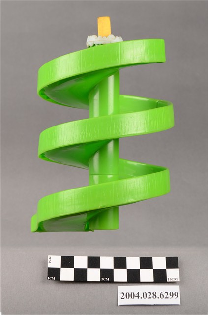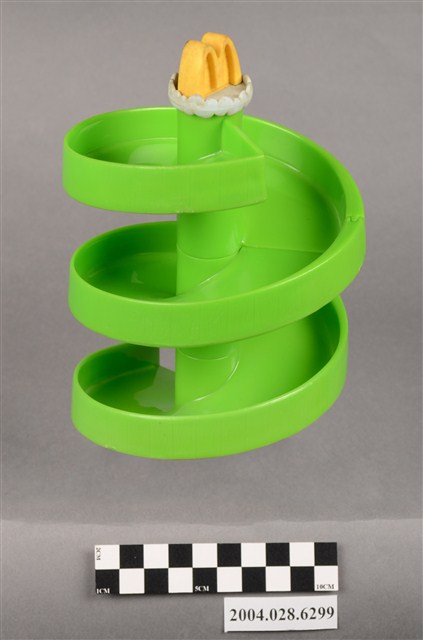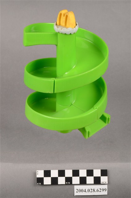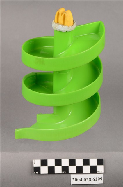 1.本物件為麥當勞旋轉塔玩具,材質為塑膠,外觀為綠色的旋轉溜滑梯,溜滑梯頂端有白色雲朵狀與黃色麥當勞M字LOGO,溜滑梯共由三個部件組成,分別在底部有「1」、「2」、「3」、「E2」字樣。