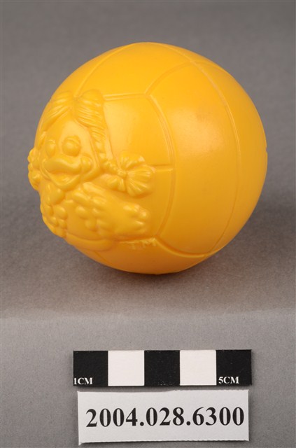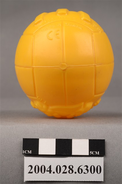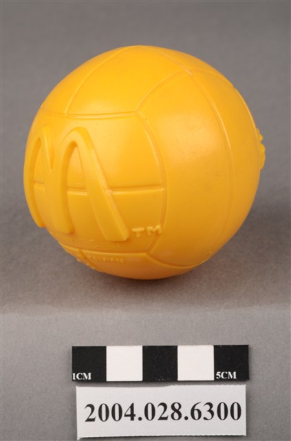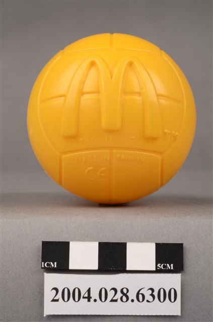 1.本物件為麥當勞大鳥姐姐黃色球玩具,材質為塑膠,外觀一顆黃色排球,表面有立體的大鳥姊姊凸起圖案,右下角有「TM」字樣,另一面為凸起的麥當勞M字LOGO右下角有「TM」字樣,下方有「1998 McD. Corp.」、「MADE IN TAIWAN」、「CE」字樣。本件與登錄號2004.028.6301藏品相同。