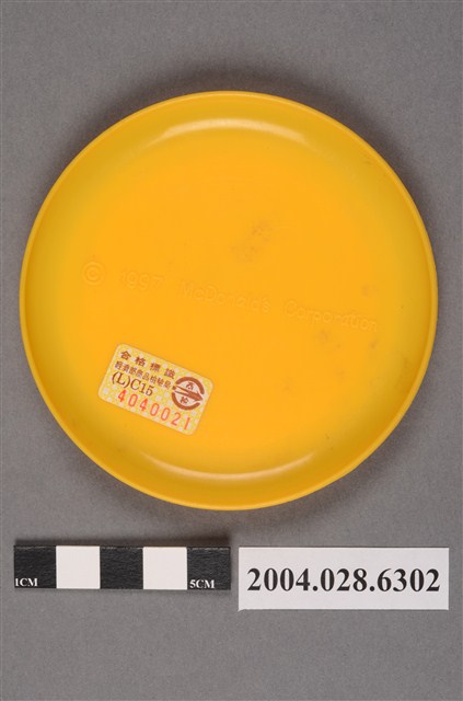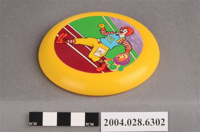 1.本物件為麥當勞麥當勞叔叔飛盤玩具,材質為塑膠,飛盤面貼有貼紙,圖案為麥當勞叔叔在跑道上奔跑的圖案,跑道為深紅色背景為綠色與紫色,麥當勞叔叔在經典服裝外穿了一件水藍色麥當勞M字LOGO背心,貼紙右下方有「TM」字樣,貼紙上被貼上另外一張貴賓狗圖案貼紙。飛盤背面有「1997 McDonald's. Corporation」及經濟部商品檢驗局合格標識貼紙,上有「(L)C15」、「4040021」字樣。本件與登錄號2004.028.6303、2004.028.6304藏品相同。