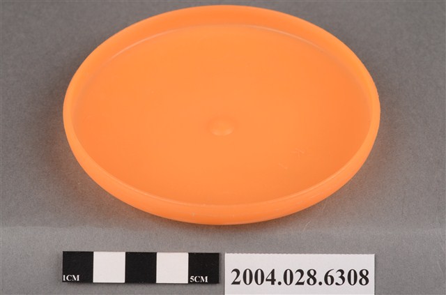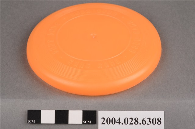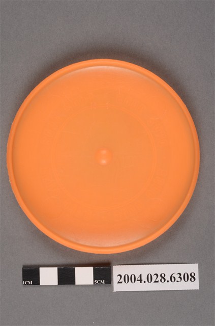 1.本物件為速食餐廳麥當勞玩具,塑膠材質。該物件乃塑膠圓形飛盤玩具,主要配色為橘色。該玩具正面可見圓形刻紋,其字樣未能清楚可見。