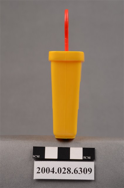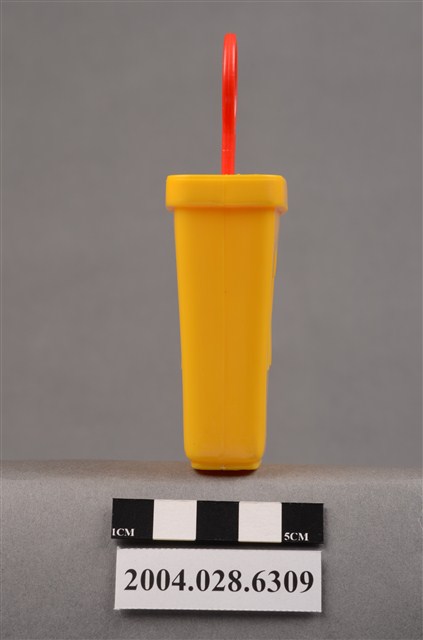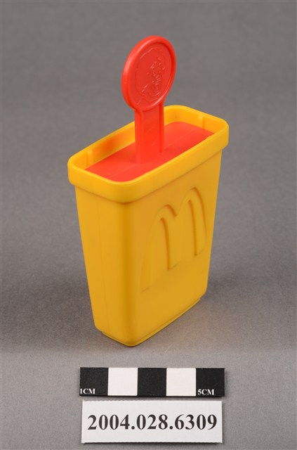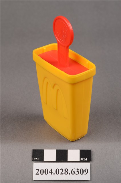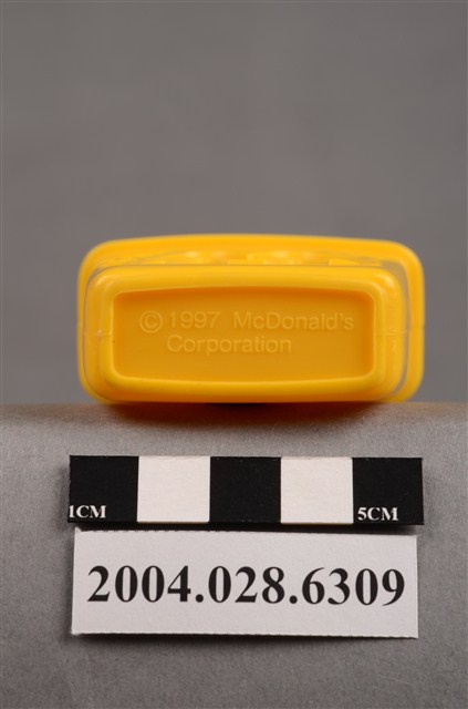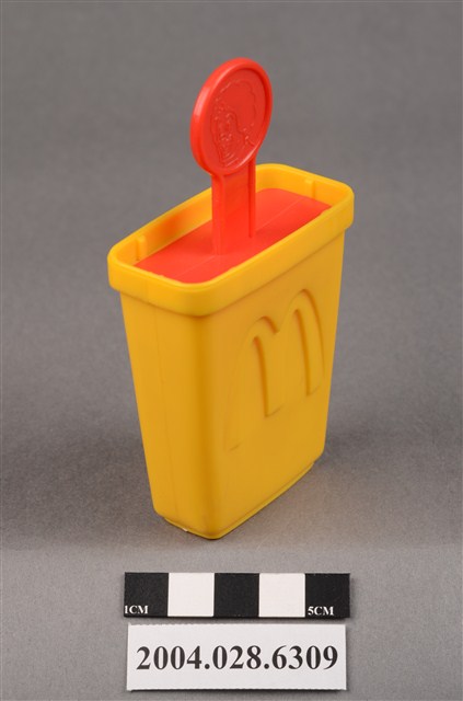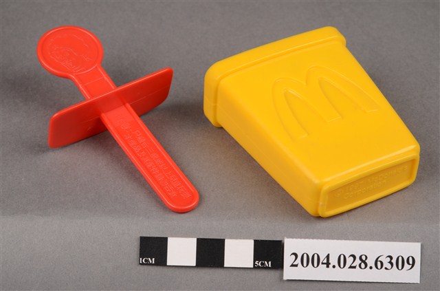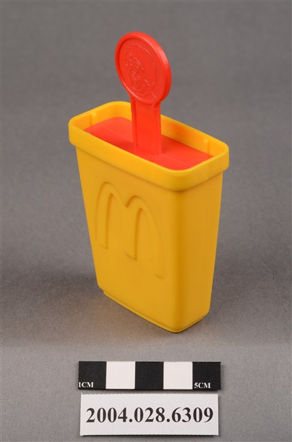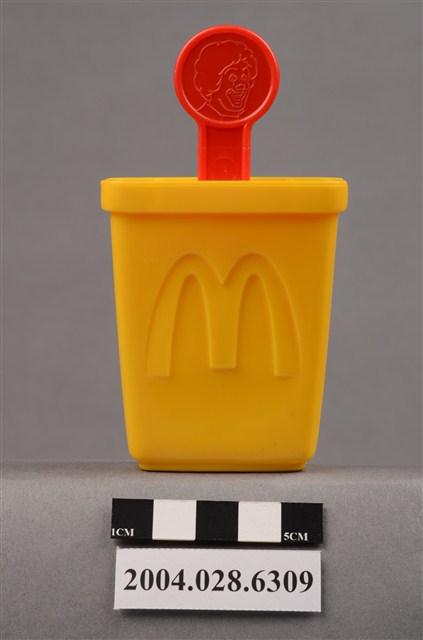 1.本物件為速食餐廳麥當勞玩具,塑膠材質。該物件乃麥當勞叔叔之塑膠製冰棒盒,主要配色為黃色及紅色。該製冰盒兩面皆有麥當勞商標圖示,底部可見「1997」、「McDonald's Corporation」字樣。其冰棒握把上方為圓形,具麥當勞叔叔圖示,下方可見「注意 只適合三歲或以上兒童玩耍 本產品及其配件請勿吞食」、「suitable for children age 3 and over」、「1997」、「McDonald's Corporation」之提醒字樣。