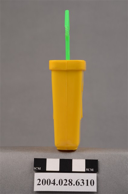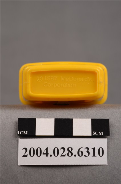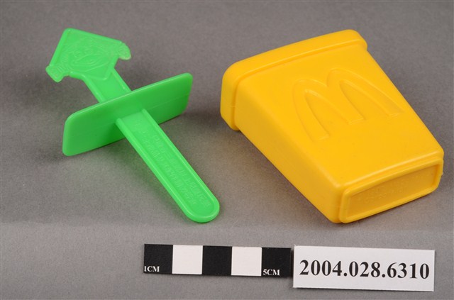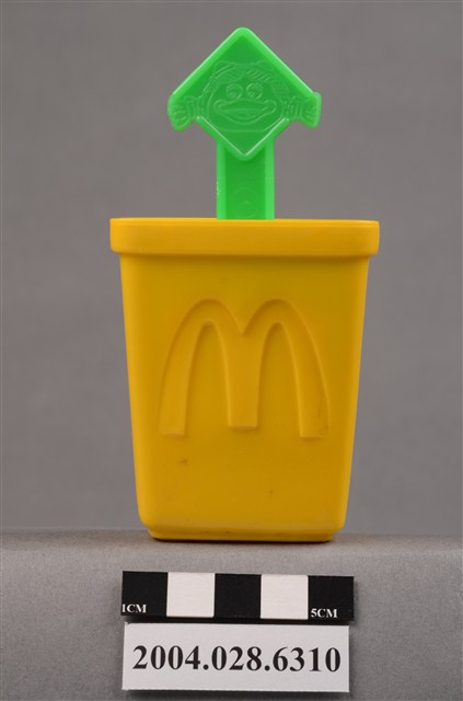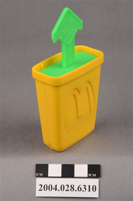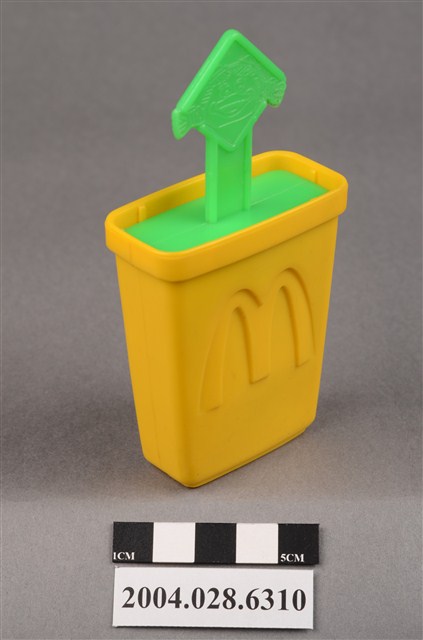 1.本物件為速食餐廳麥當勞玩具,塑膠材質。該物件乃大鳥姐姐之塑膠製冰棒盒,主要配色為黃色及綠色。該製冰盒兩面皆有麥當勞商標圖示,底部可見「1997」、「McDonald's Corporation」字樣。其冰棒握把上方為菱形,具大鳥姐姐圖示,下方可見「注意 只適合三歲或以上兒童玩耍 本產品及其配件請勿吞食」、「suitable for children age 3 and over」、「1997」、「McDonald's Corporation」之提醒字樣。