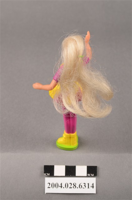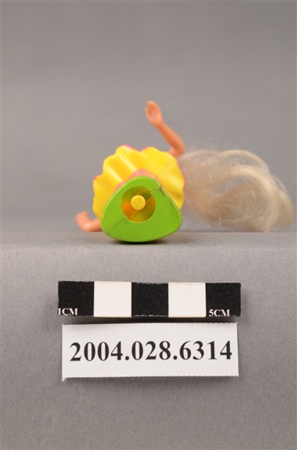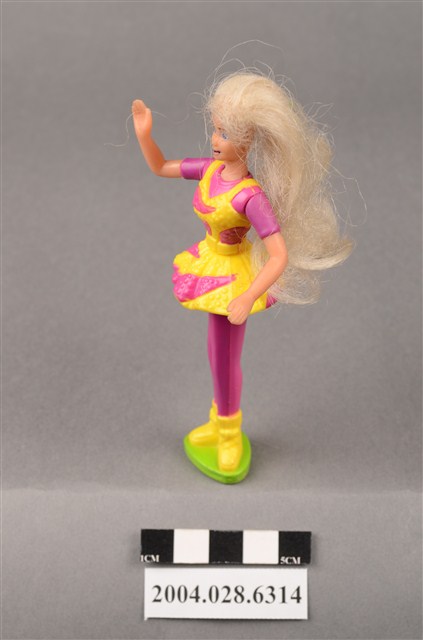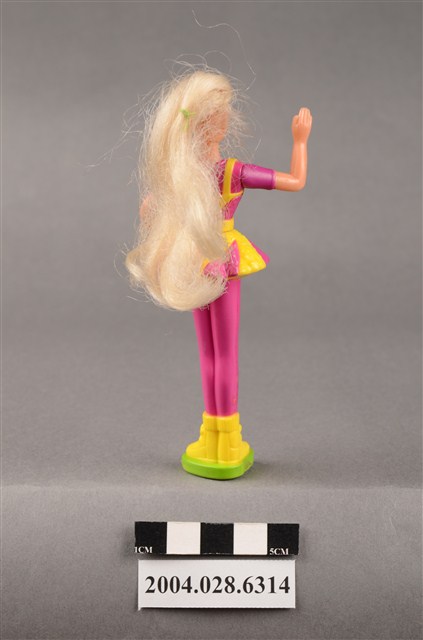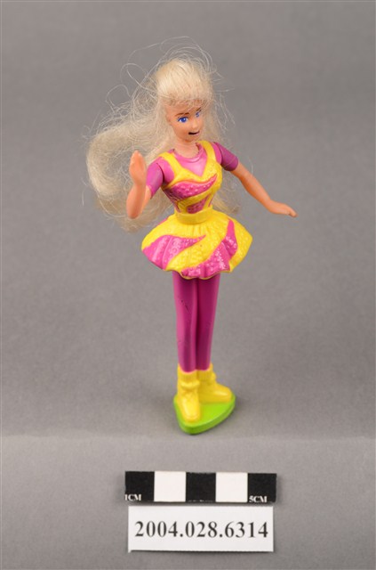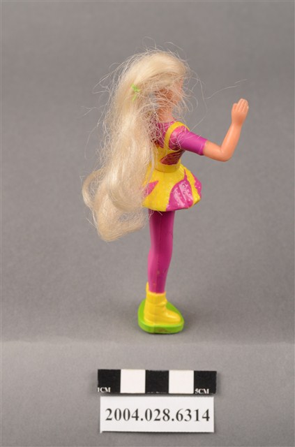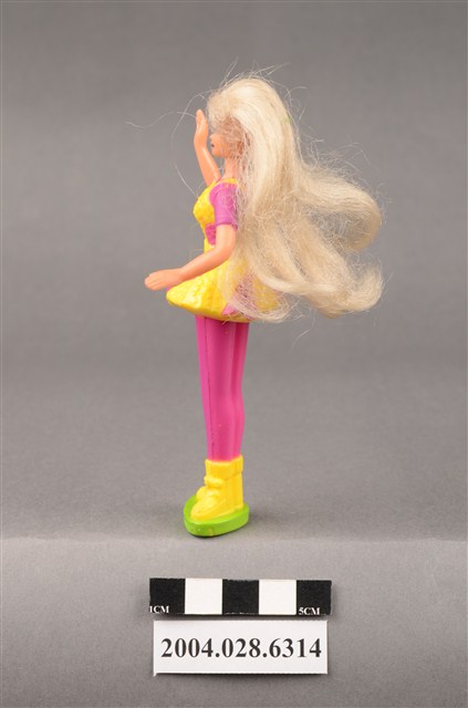 本文物為美泰兒公司發行之紫衣黃裙芭比娃娃,碧藍色眼睛、長直髮,腳穿黃色短靴,站在綠色三角盤上,紫色衣褲搭配黃紫雙色相間短裙,雙臂的部位可以轉動。1945年,露絲.韓德勒(B.Ruth Handler)與丈夫艾略特.漢德勒(Elliot Handler)、Harold Matson三人在一間車房創辦了美泰兒(Mattel)公司,1959年,露絲.韓德勒由女兒裁剪成人紙娃娃啓發,發表了當時世界最有名的芭比娃娃(芭比娃娃),受到極大批的小女孩及母親歡迎,至今已售出超過10億支娃娃。