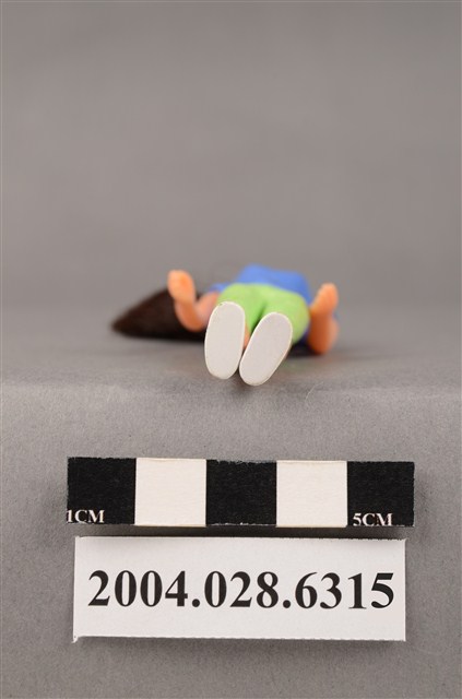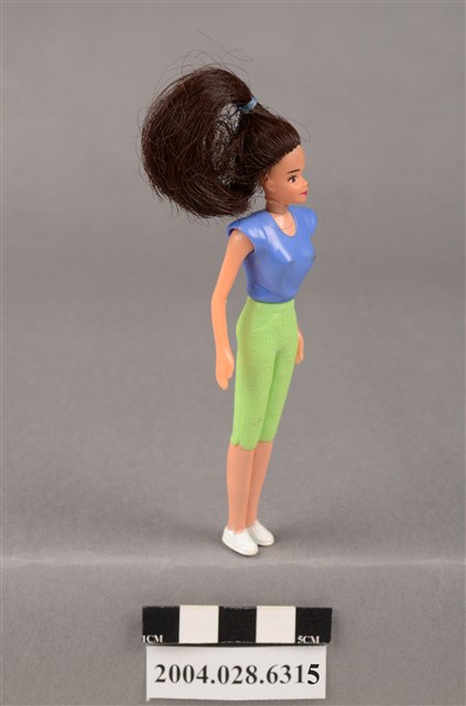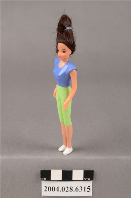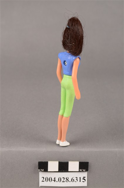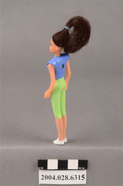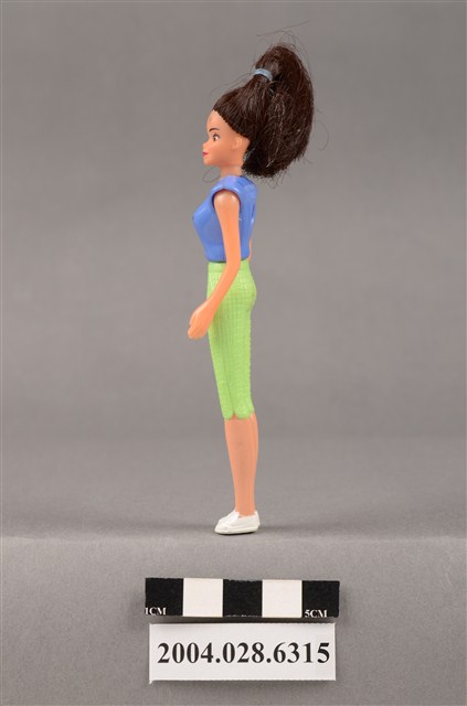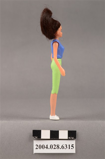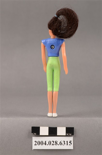 本文物為美泰兒公司發行之藍衣綠褲芭比娃娃,褐色眼睛、烏黑長髮被束起來,腳穿白色平底鞋。藍色素面上衣背後栓有一螺絲,且印有年份1999及英文字表示美泰兒公司製造的芭比;綠色花紋高腰褲背後亦印有英文字。1945年,露絲.韓德勒(B.Ruth Handler)與丈夫艾略特.漢德勒(Elliot Handler)、Harold Matson三人在一間車房創辦了美泰兒(Mattel)公司,1959年,露絲.韓德勒由女兒裁剪成人紙娃娃啓發,發表了當時世界最有名的芭比娃娃(芭比娃娃),受到極大批的小女孩及母親歡迎,至今已售出超過10億支娃娃。