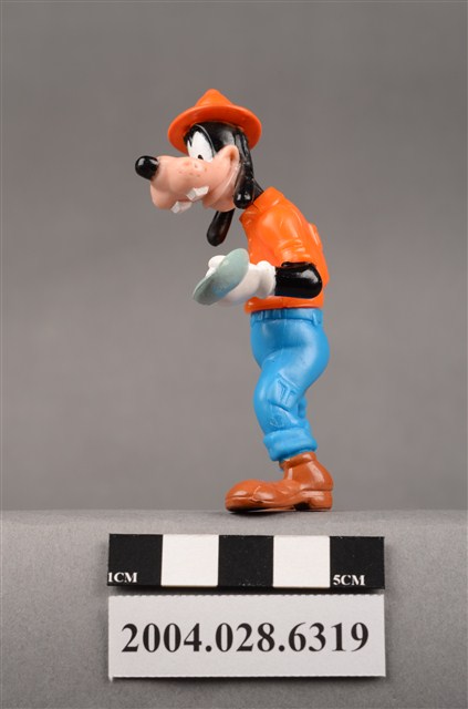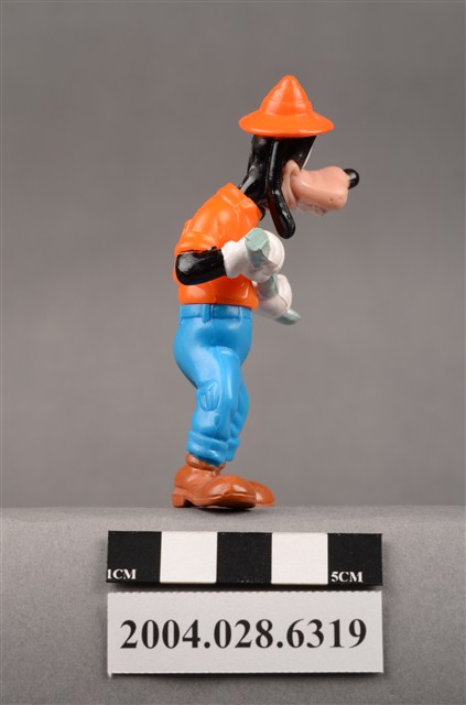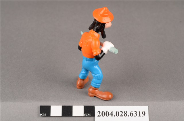 1.本物件為速食餐廳麥當勞玩具,塑膠材質。該物件乃麥當勞高飛發掘恐龍之謎之塑膠玩具,主要配色為橘、藍、灰色。其身著橘色上衣、藍色下褲,頭戴橘色短帽、手持灰色鏟子。該玩具底部可見「1996」、「McD Corp」、「Disney」、「Made In China」、「43 S.S. 223」、「TF 16」字樣。