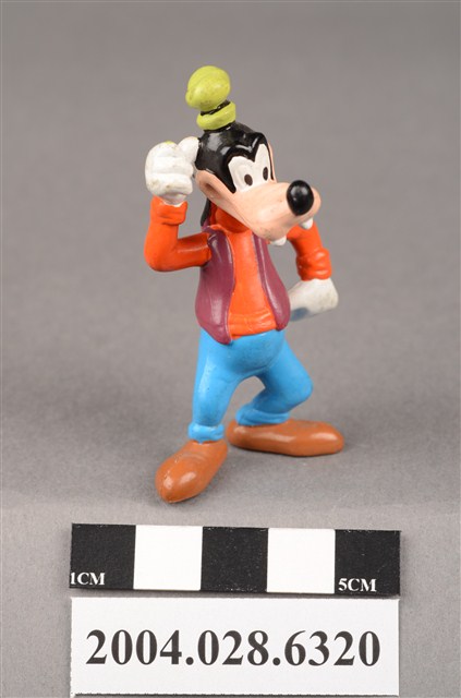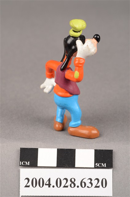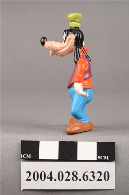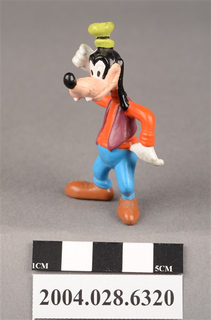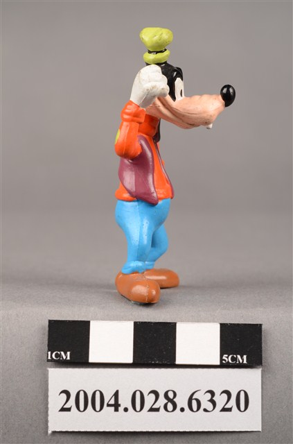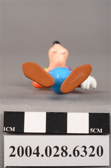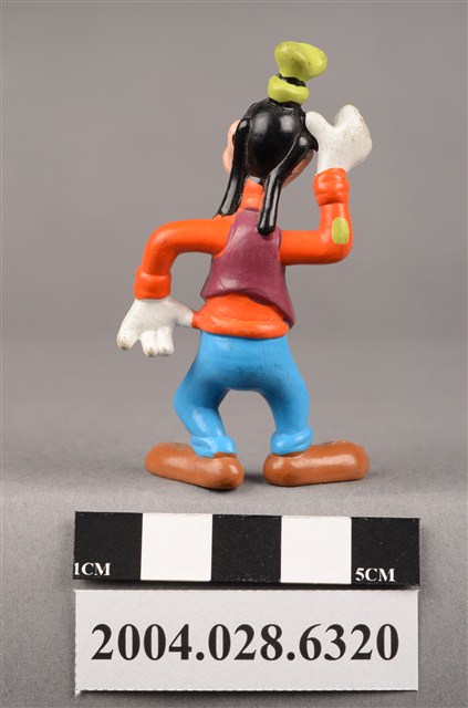 1.本物件為速食餐廳麥當勞玩具,塑膠材質。該物件乃麥當勞高飛之塑膠玩具,主要配色為橘、藍、綠色。其身著橘色上衣、藍色下褲,頭戴綠色短帽,右手放置於頭上、左手置於腰間。該玩具底部可見「Disney」字樣。