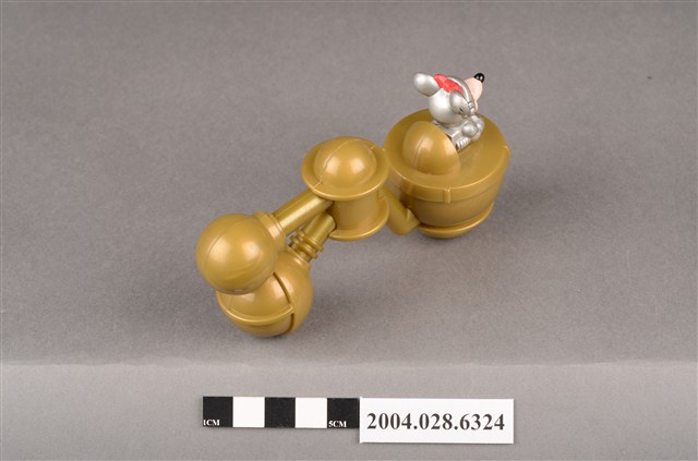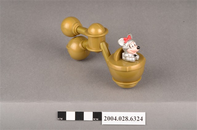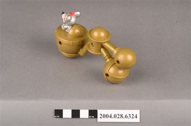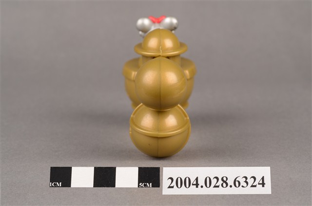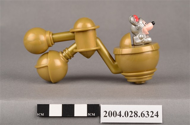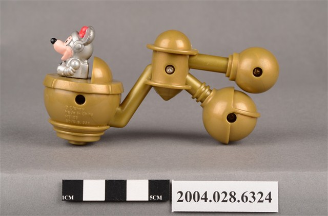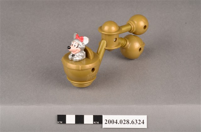 1.本物件為速食餐廳麥當勞玩具,塑膠材質。該物件乃麥當勞米妮太空觀察站之塑膠玩具,主要配色為金、銀、白色。其頭戴紅色蝴蝶結、身著銀色太空衣,雙手掌握黑色方向盤,坐在金色物件內。該金色物件為球體,後方連接兩個較小之球體,並標示「Disney」、「Made In China」、「MT 02」、「90 S.S.223」字樣。