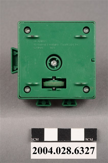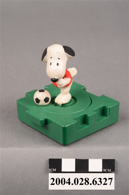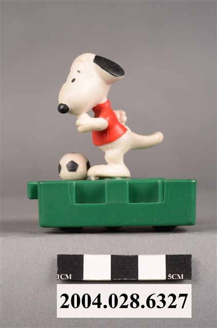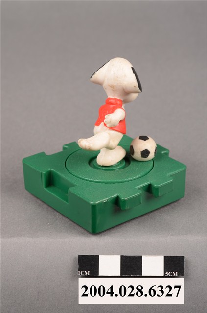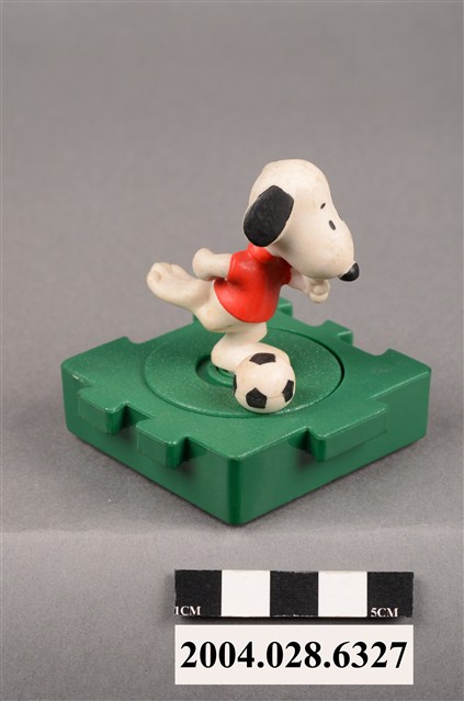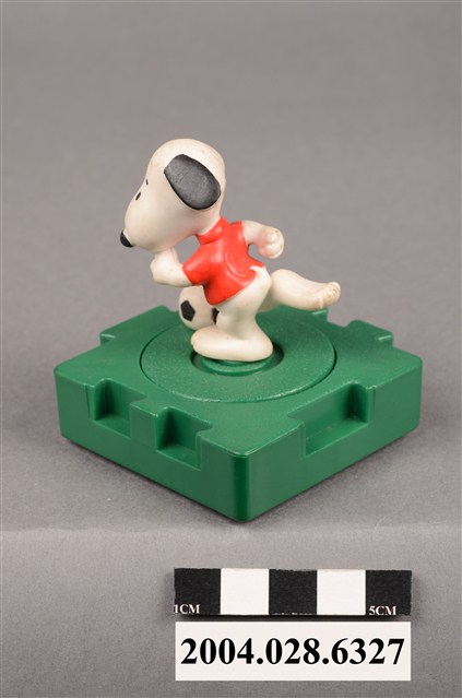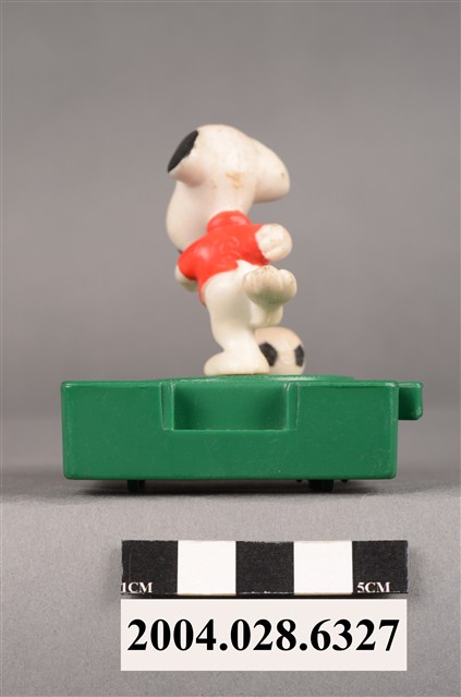 1.本物件為速食餐廳麥當勞玩具,塑膠材質。該物件乃麥當勞史努比足球之塑膠玩具,主要配色為白、綠、紅色。其身著紅色上衣,腳踢足球,站立於綠色平臺上方。物件底部標示「PEANUTS」、「United Feature Syndicate, Inc.」、「CHINA」、「KH」字樣。