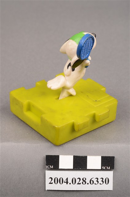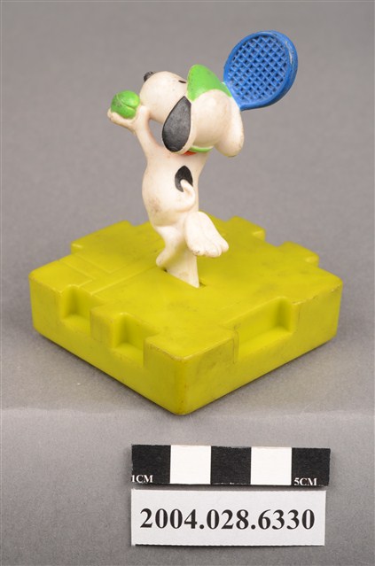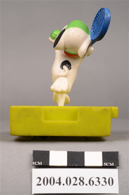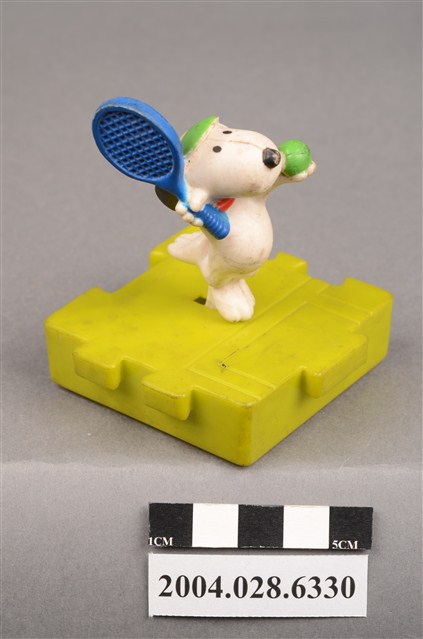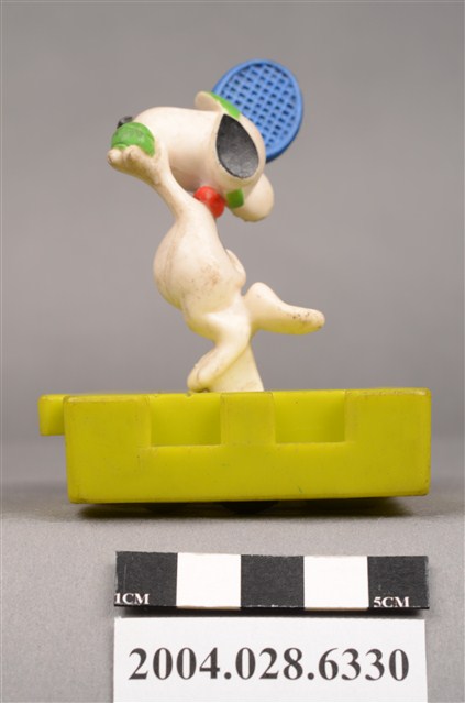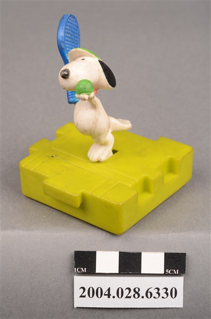 1.本物件為速食餐廳麥當勞玩具,塑膠材質。該物件乃麥當勞史奴比網球之塑膠玩具,主要配色為白、綠、藍、黃色。其右手持藍色網球拍、左手持綠色網球,站立於黃色平臺上方。物件底部標示「PEANUTS」、「United Feature Syndicate, Inc.」、「CHINA」、「KH」字樣。